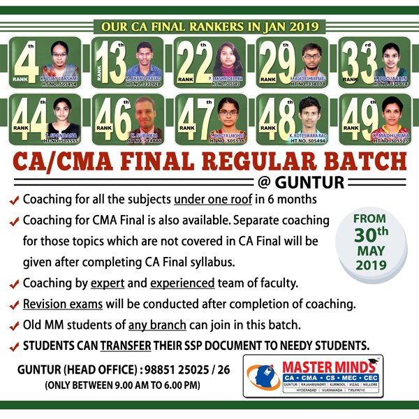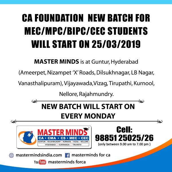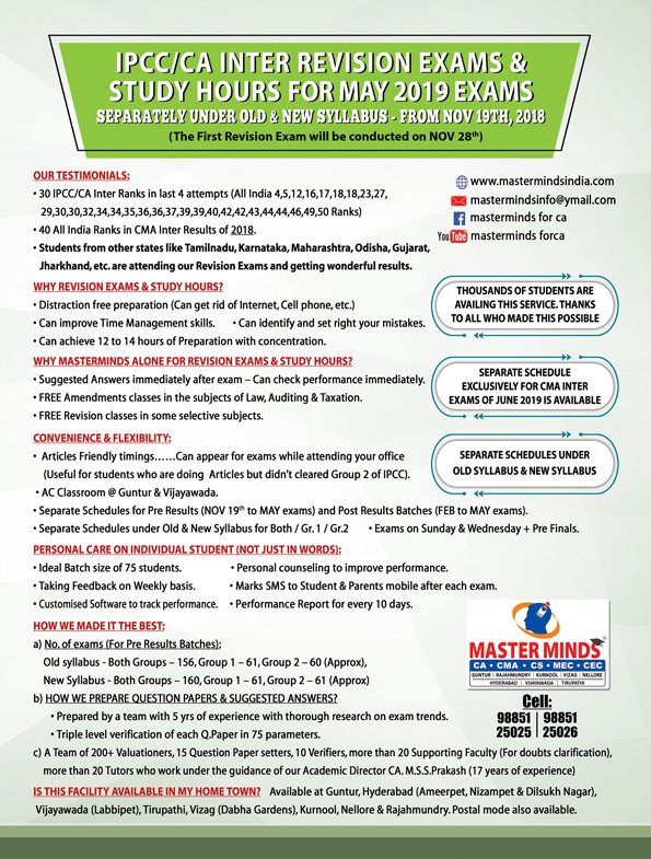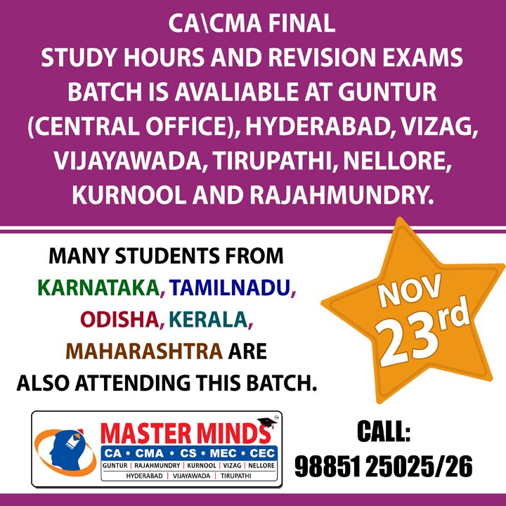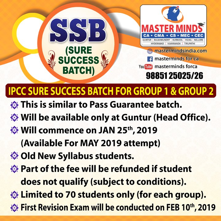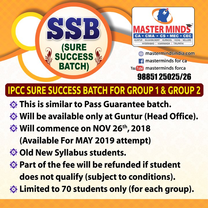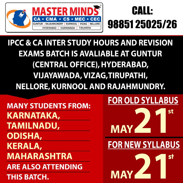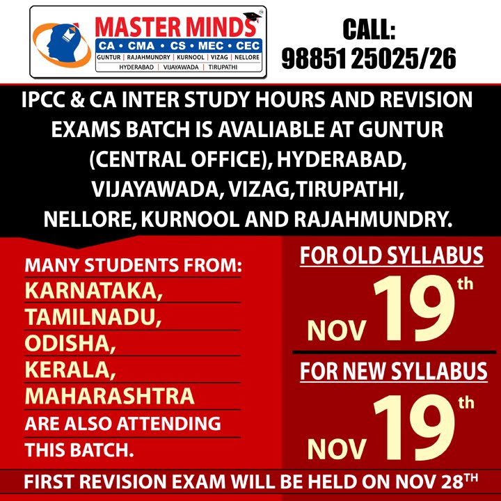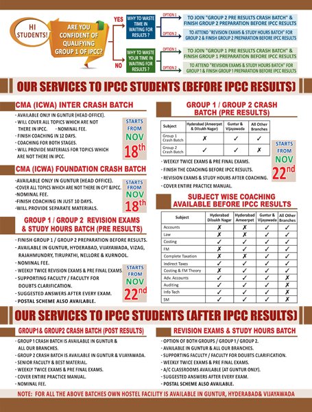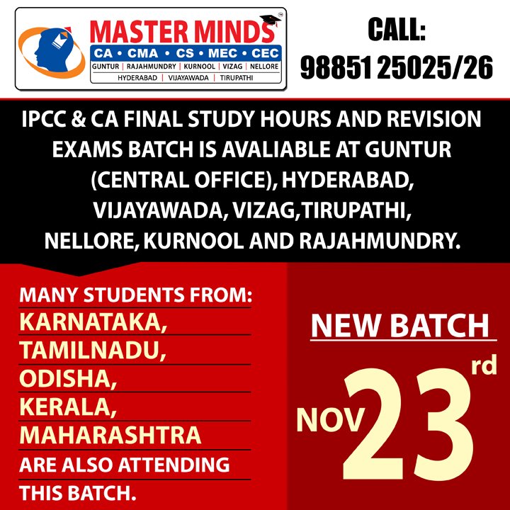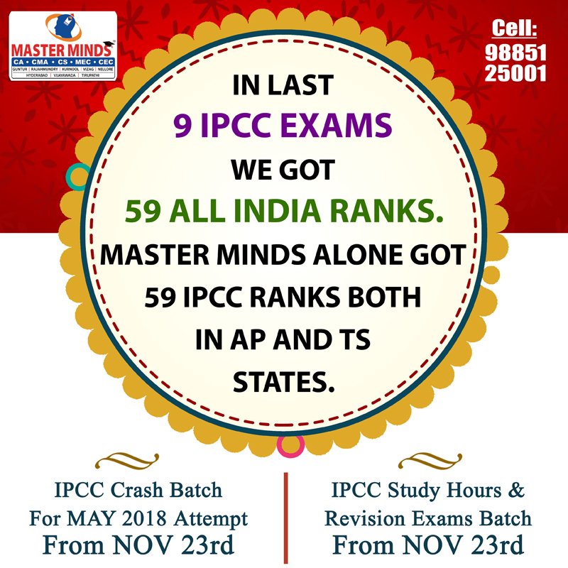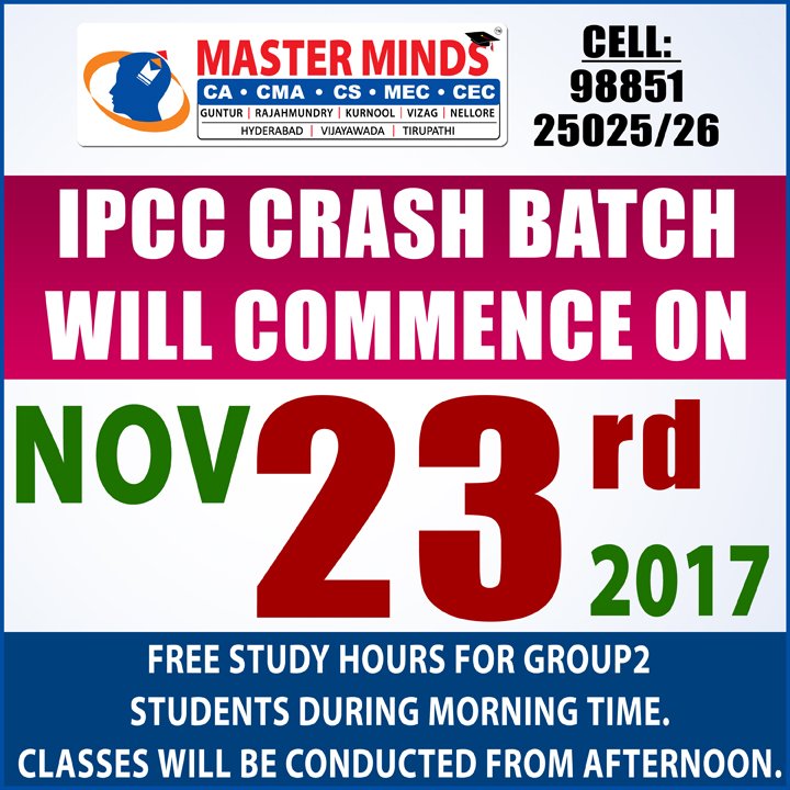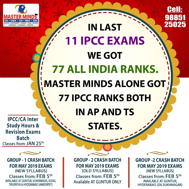 Next IPCC batch will commence from dec 27th at Guntur and from Jan 22nd at Kurnool. Details 92487 33315 / 13 |