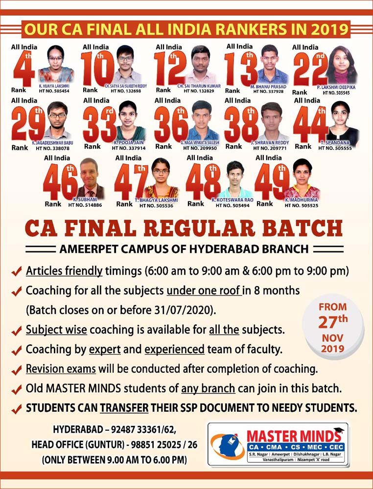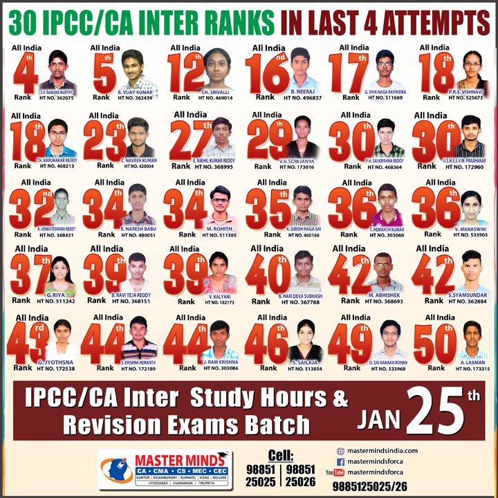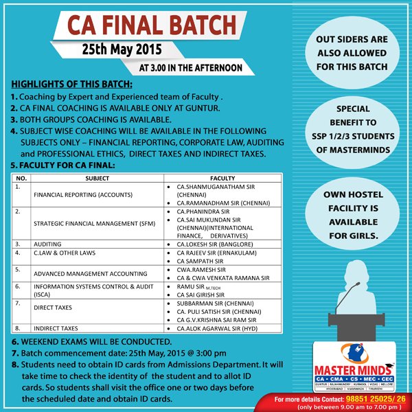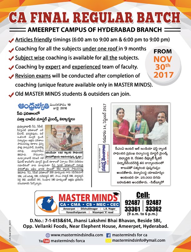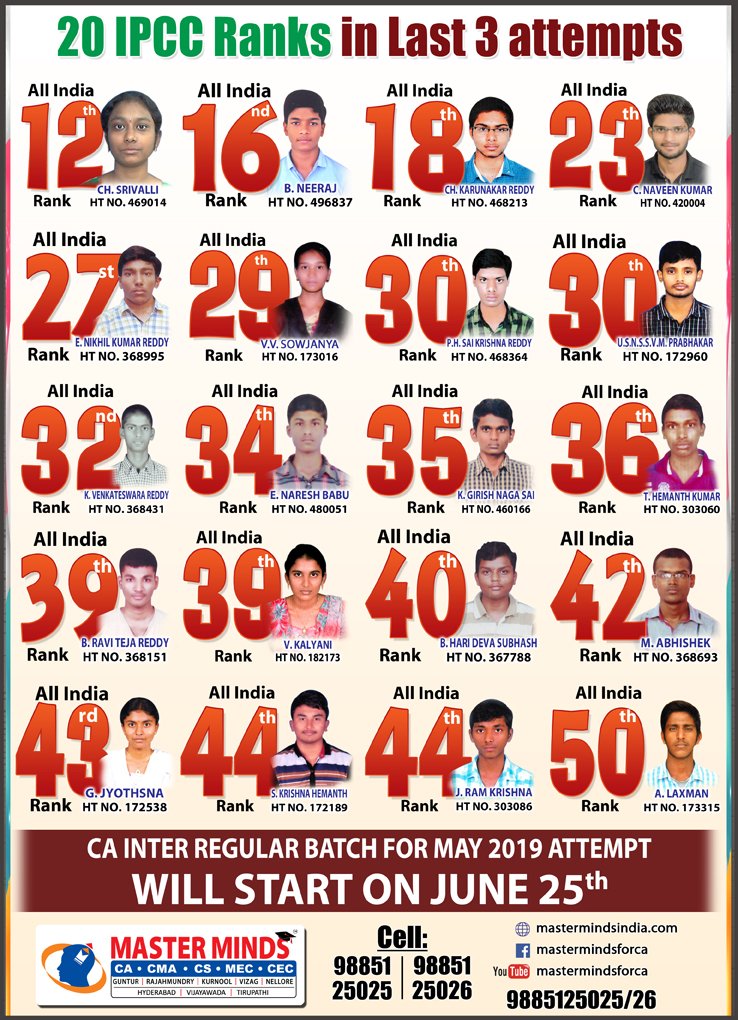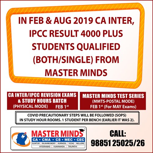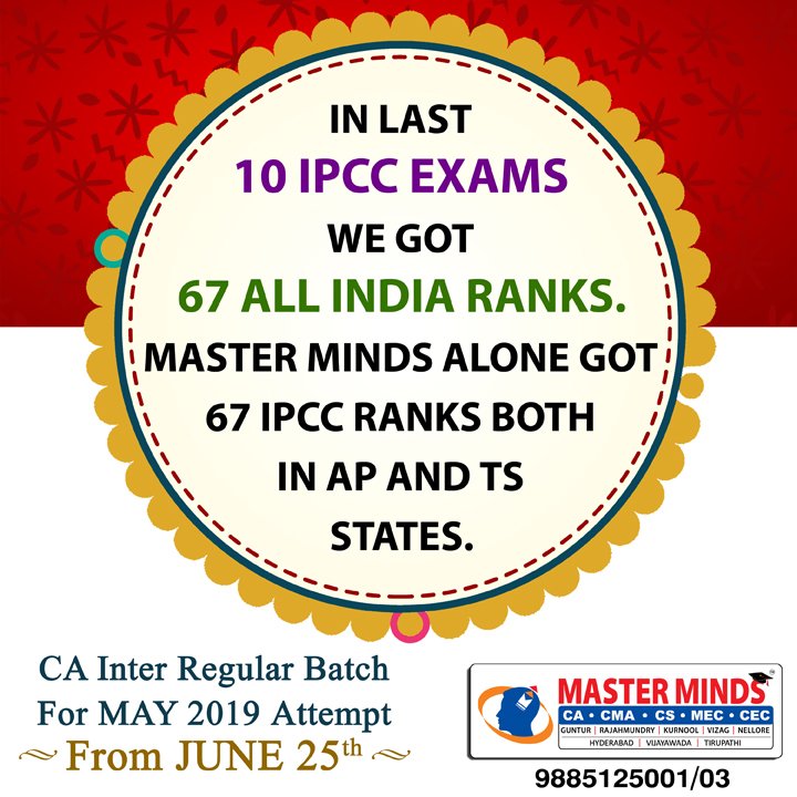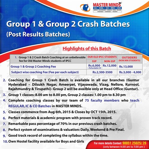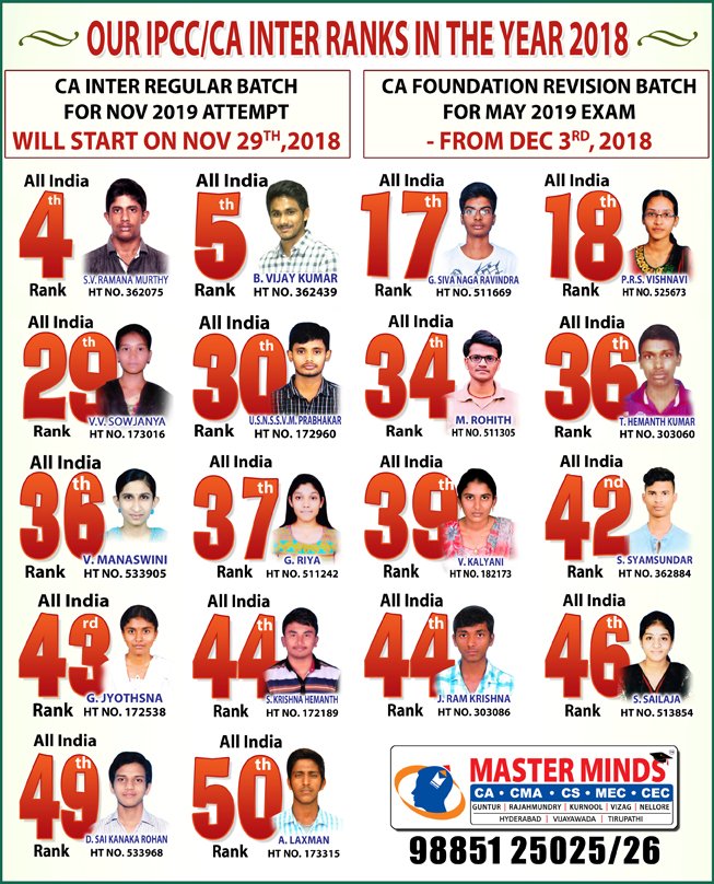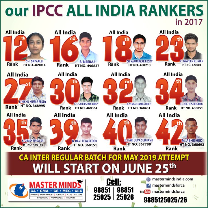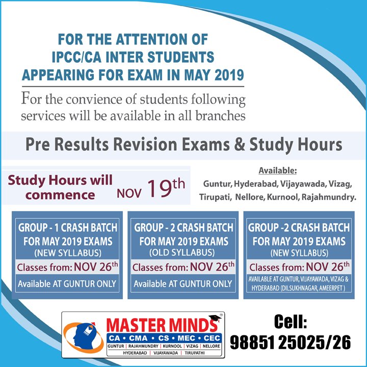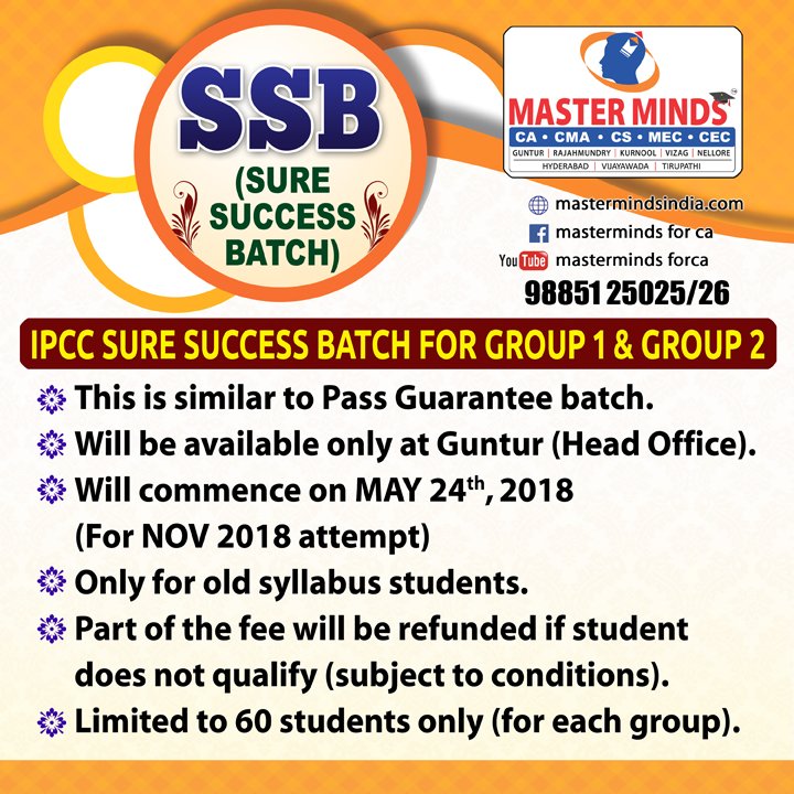 Next IPCC batch will commence from dec 27th at Guntur and from Jan 22nd at Kurnool. Details 92487 33315 / 13 |