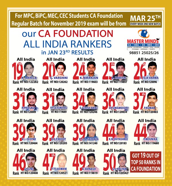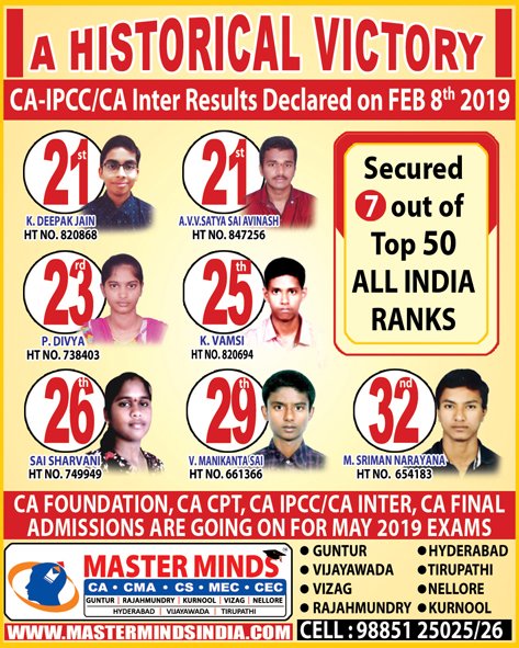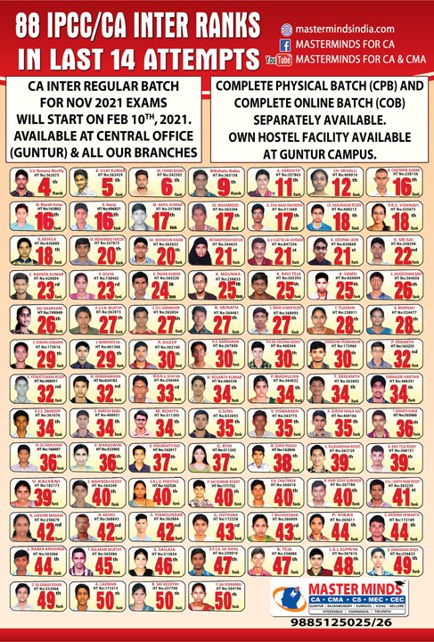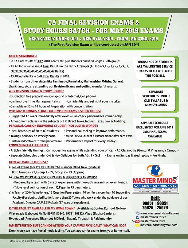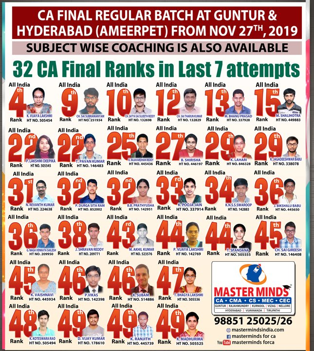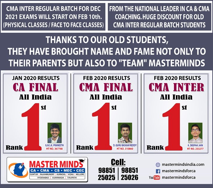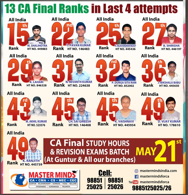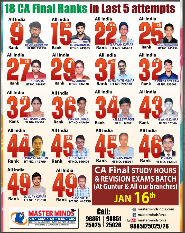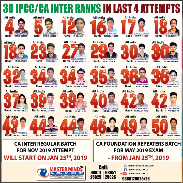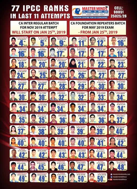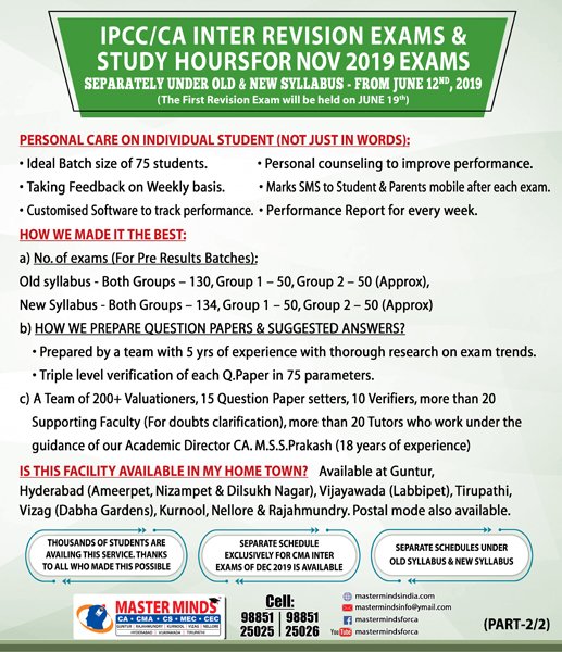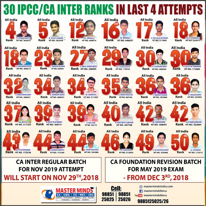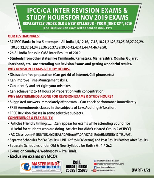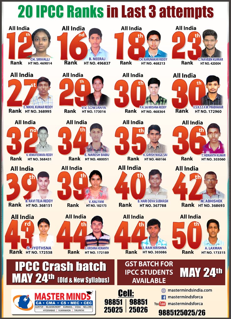 Next IPCC batch will commence from dec 27th at Guntur and from Jan 22nd at Kurnool. Details 92487 33315 / 13 |