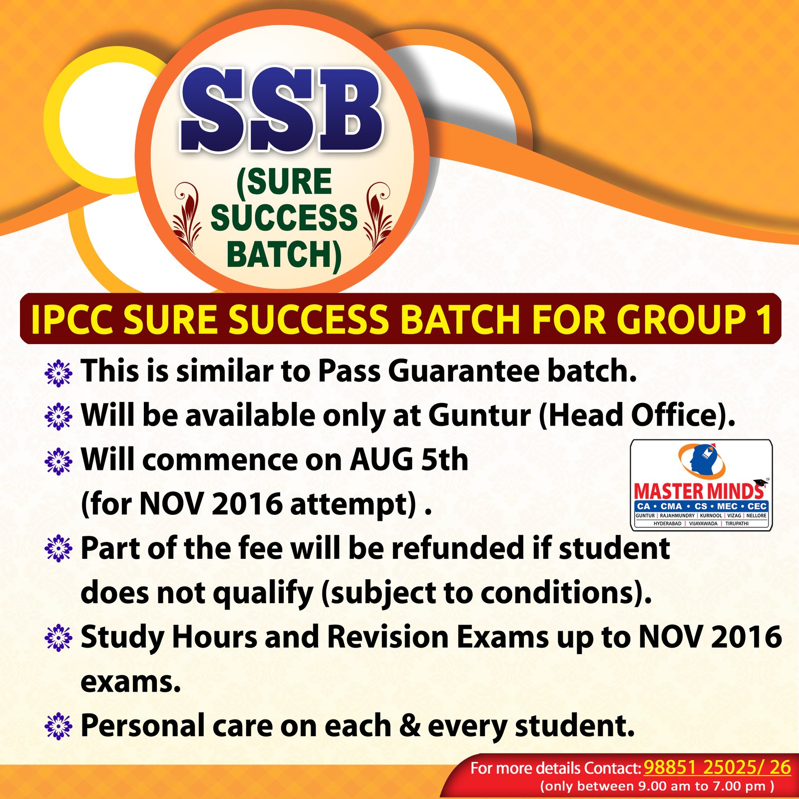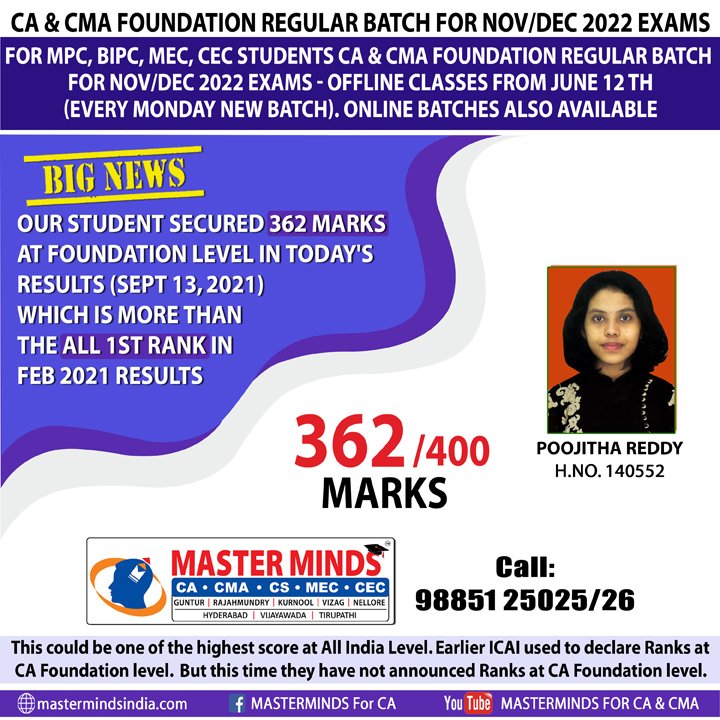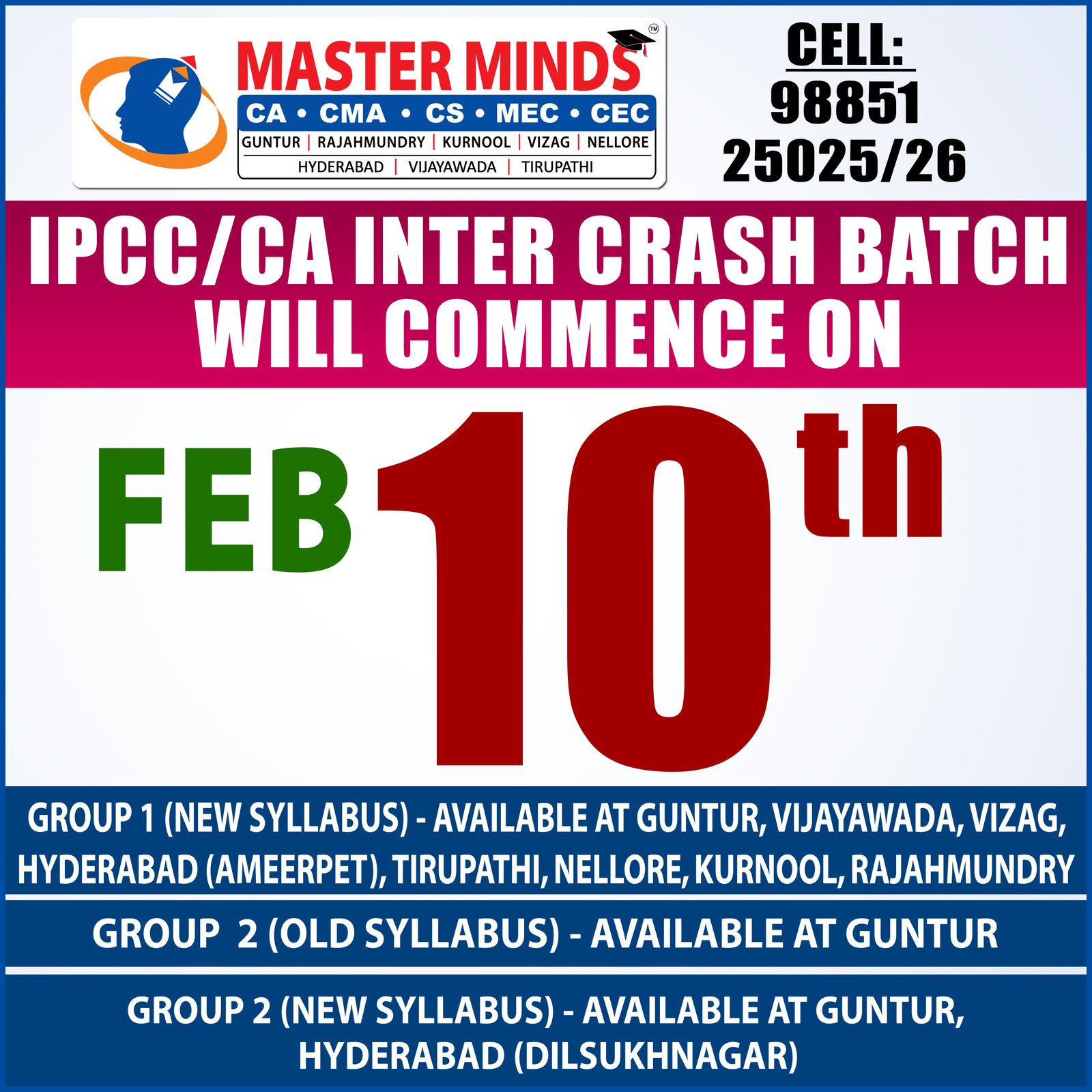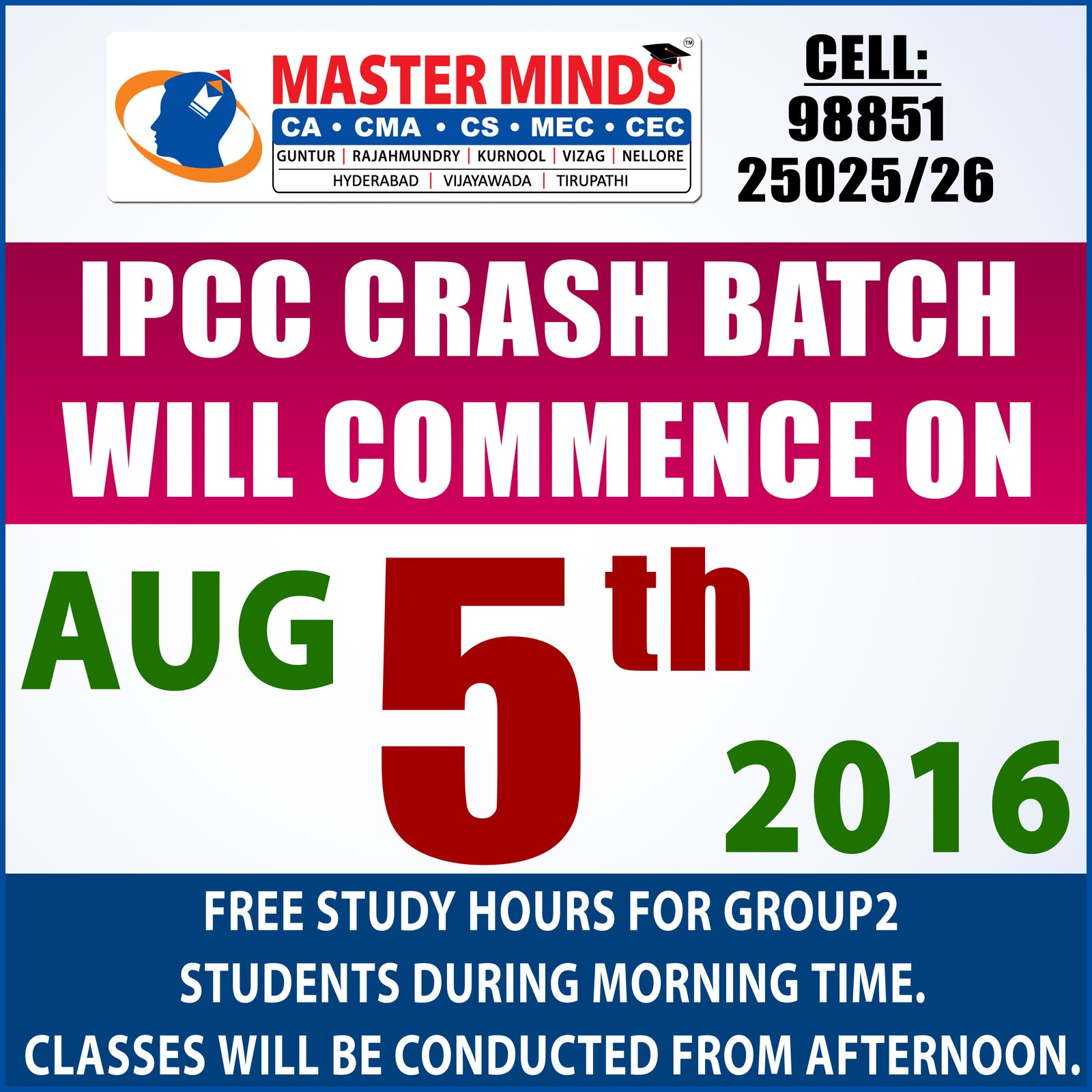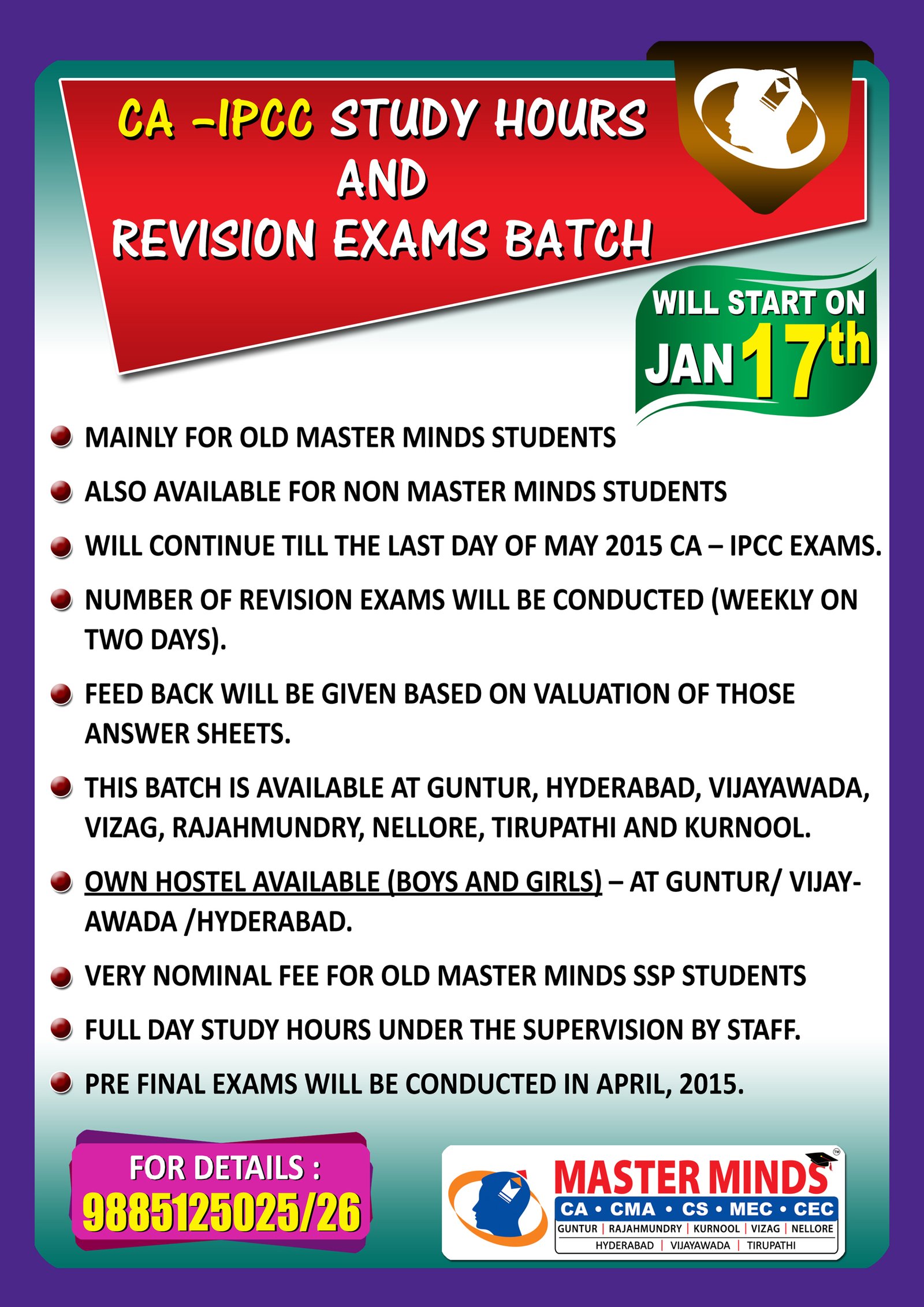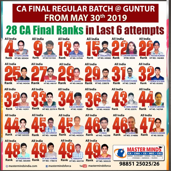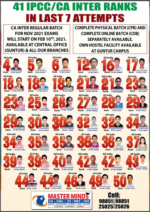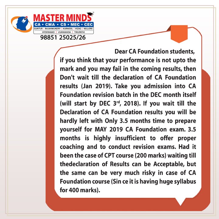 Next IPCC batch will commence from dec 27th at Guntur and from Jan 22nd at Kurnool. Details 92487 33315 / 13 |