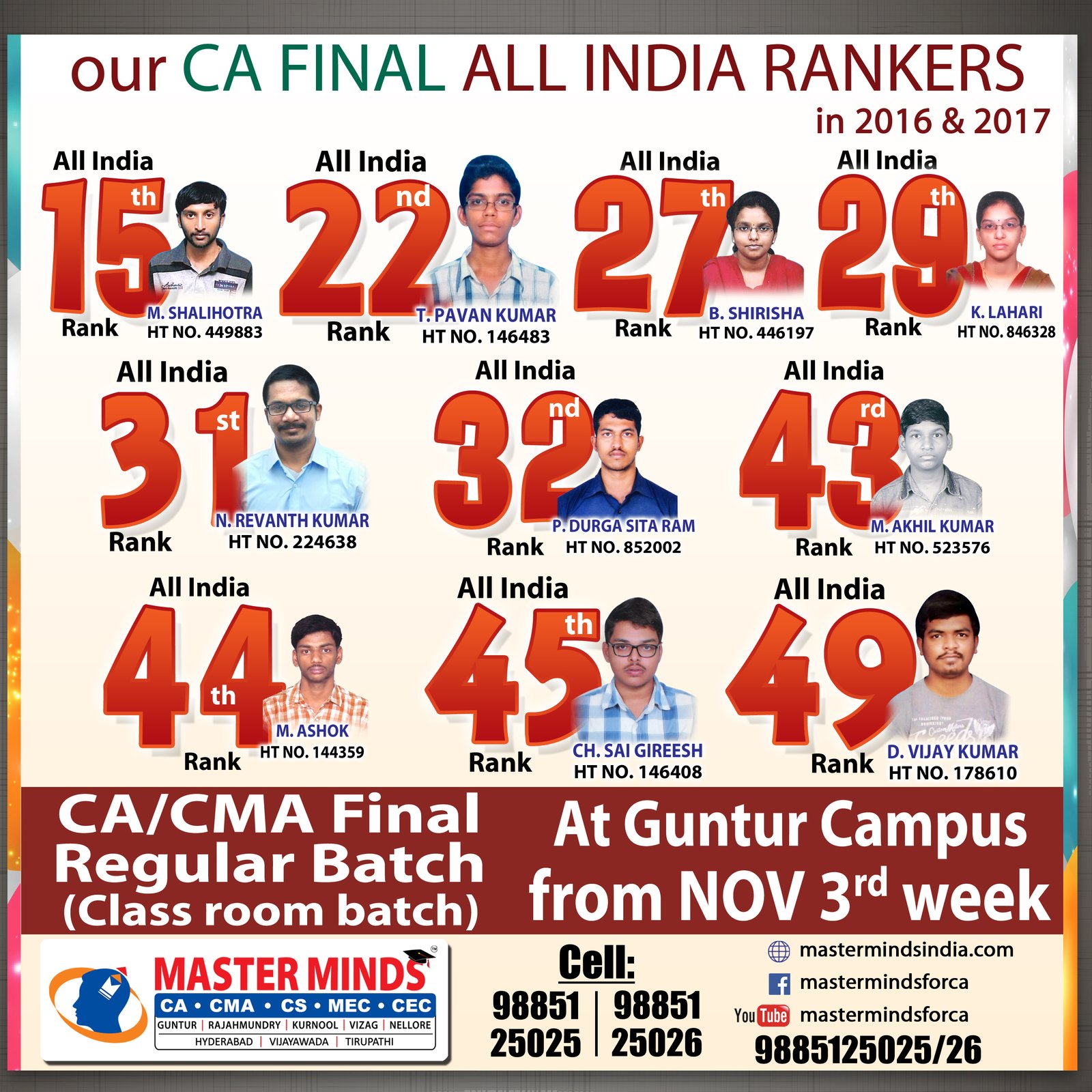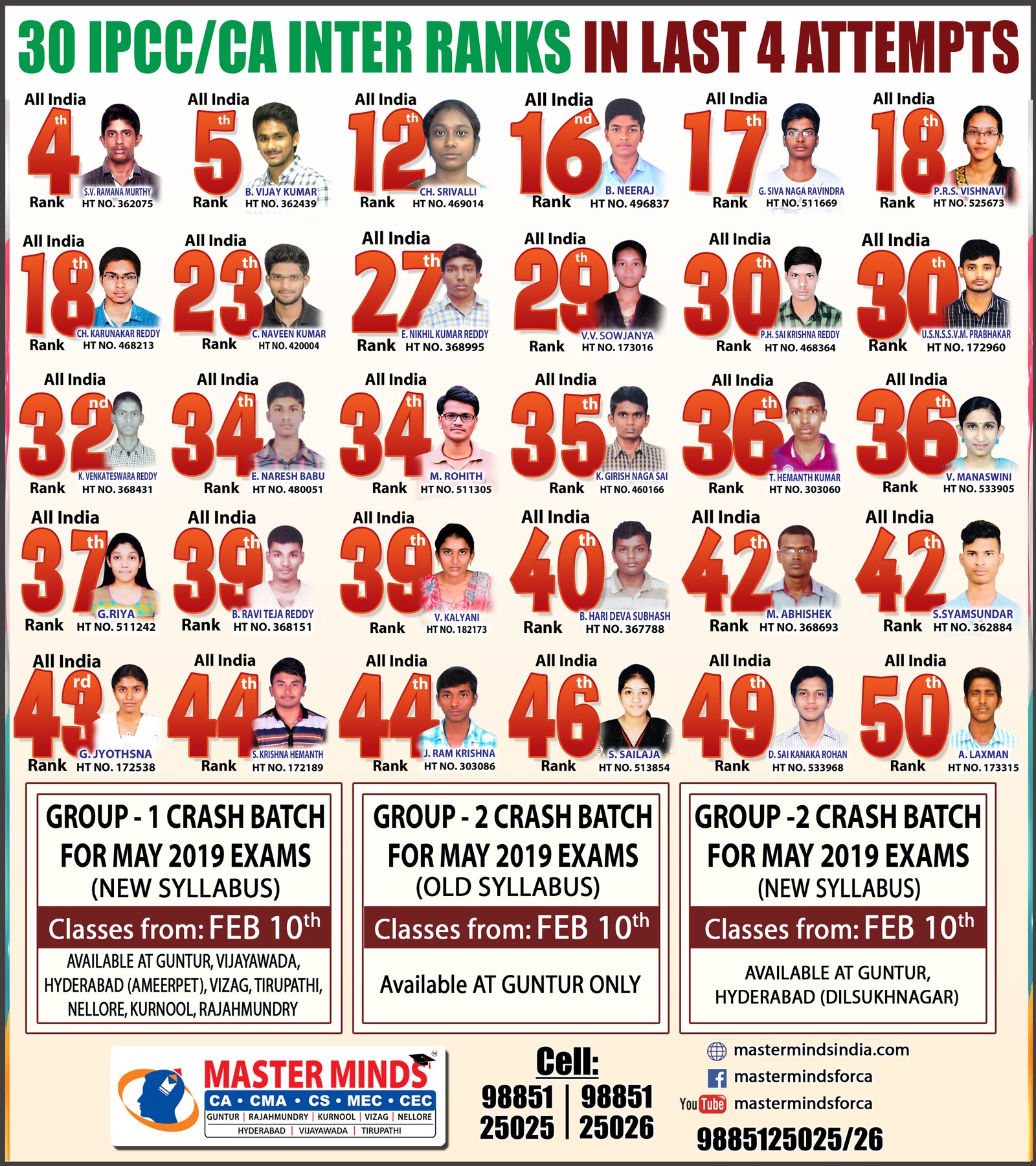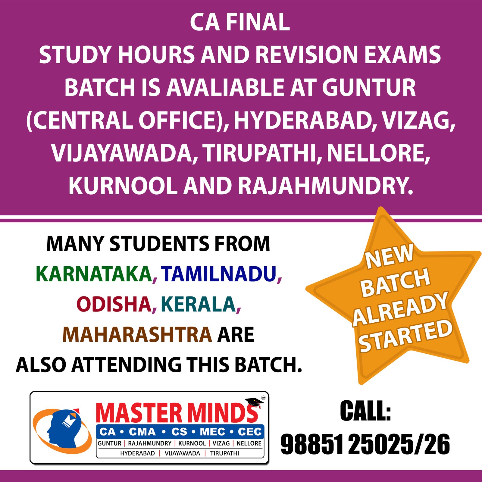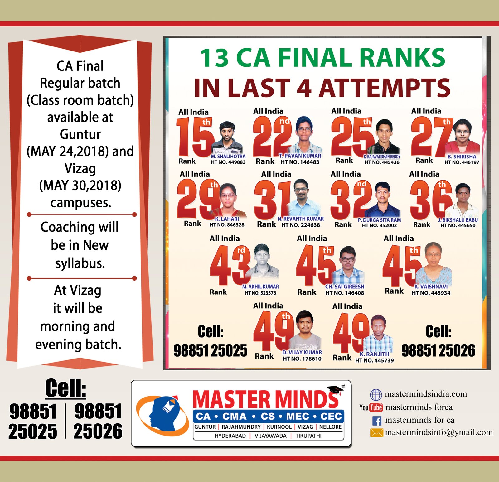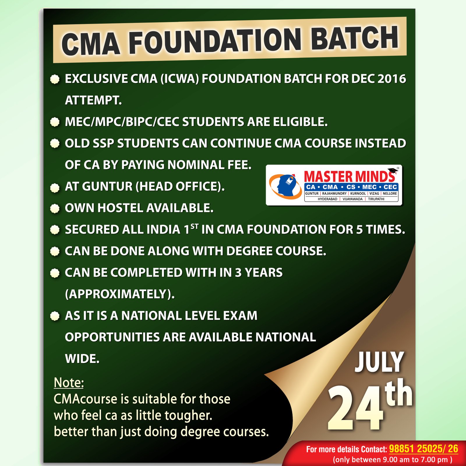 Next IPCC batch will commence from dec 27th at Guntur and from Jan 22nd at Kurnool. Details 92487 33315 / 13 |