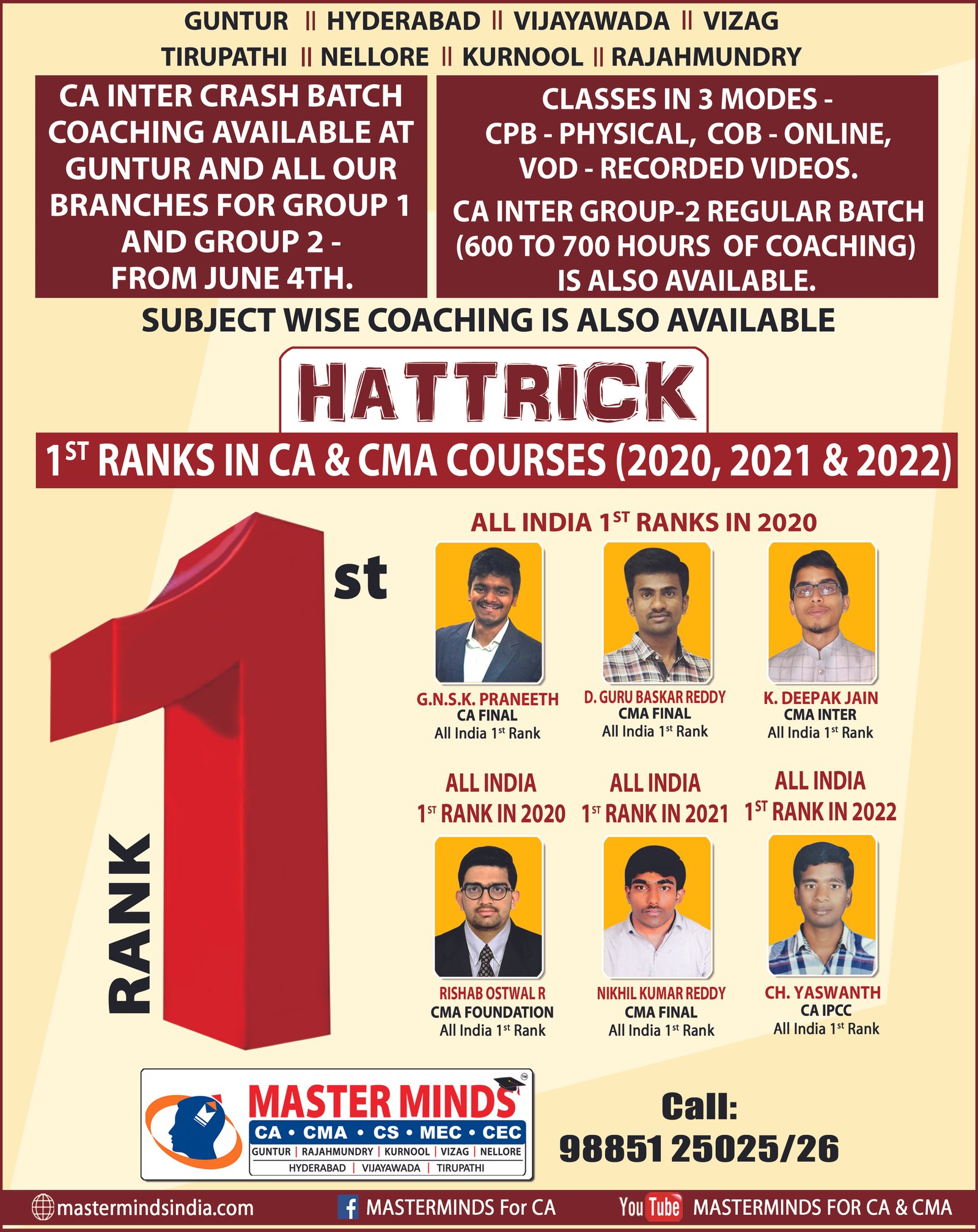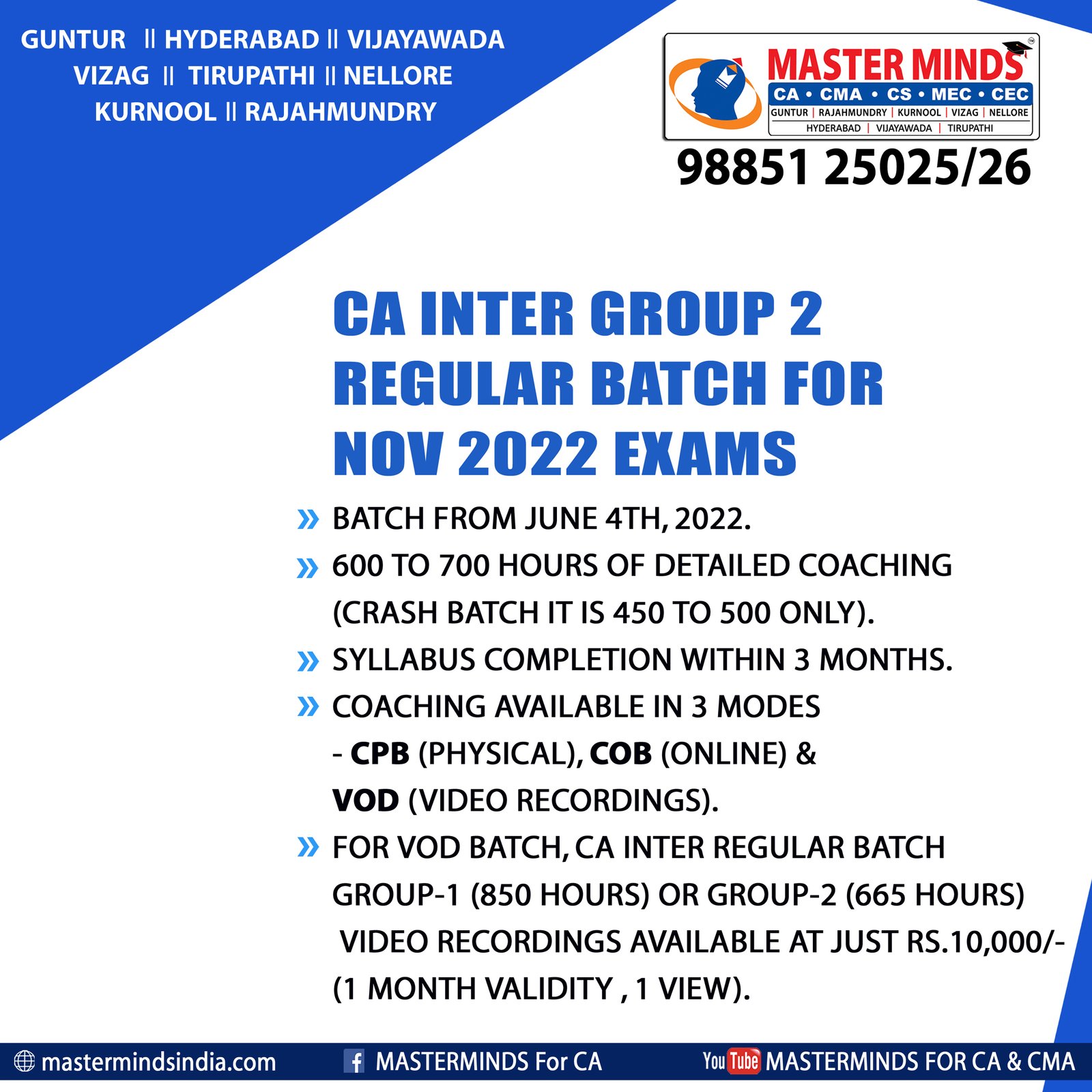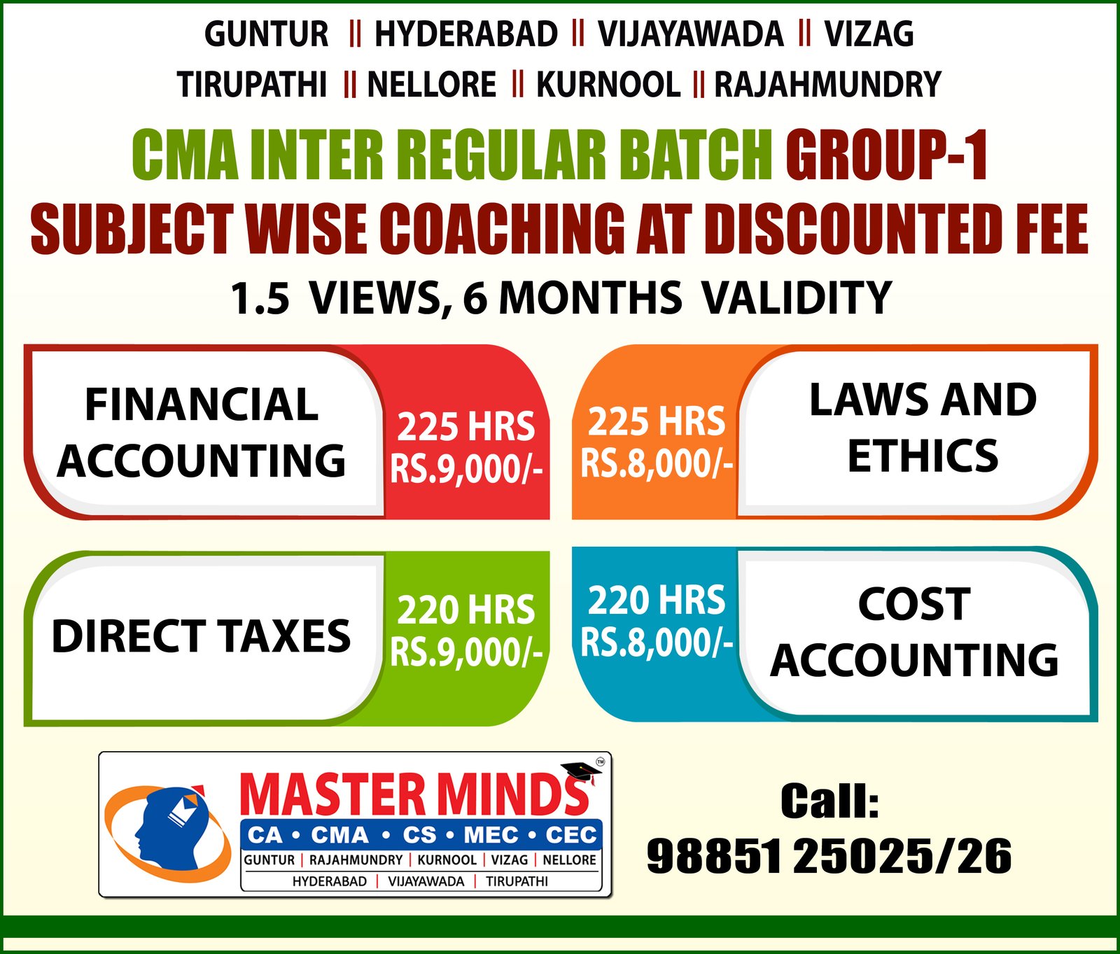 IPCC Batches commencing from June 30th at Guntur, Hyderabad, Vijayawada, Vizag, Tirupathi, Rajahmundry, Nellore and kurnool. For details Contact.... 98851 25025 / 26  |
