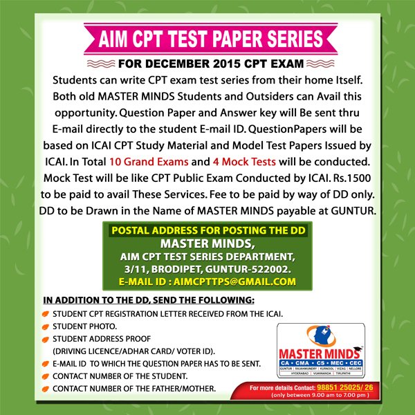 Guntur Branch of CA Institue is conducting CPT Model Exams on Dec' 6th. We recomand all our students to take of this Exam. For details 924873316. |