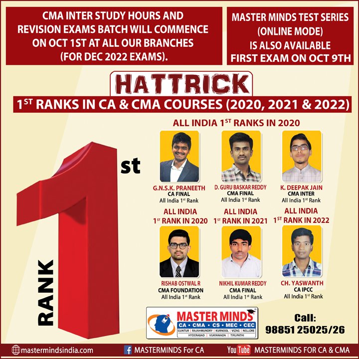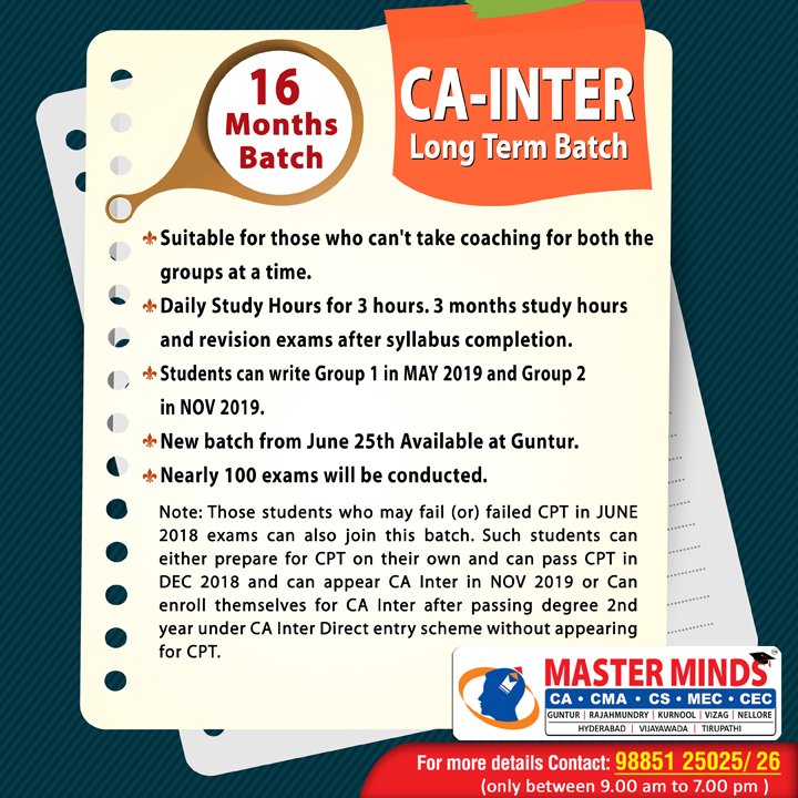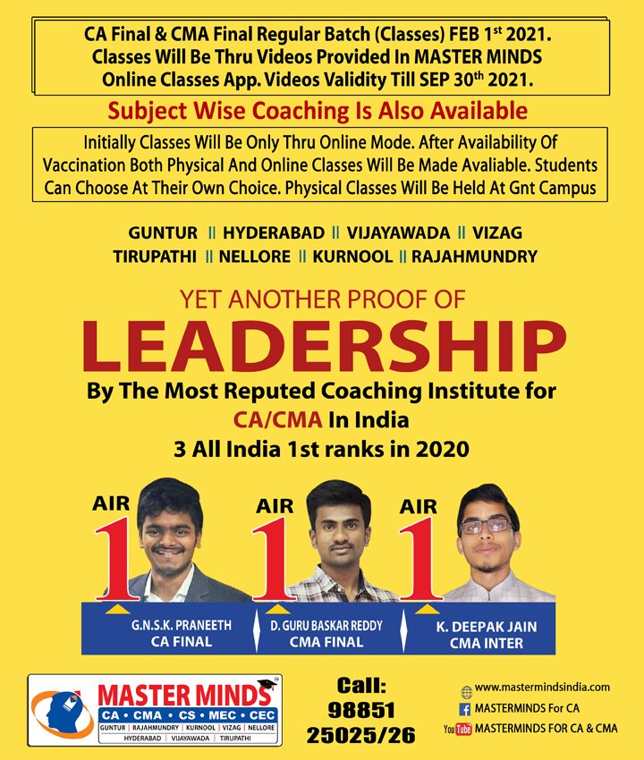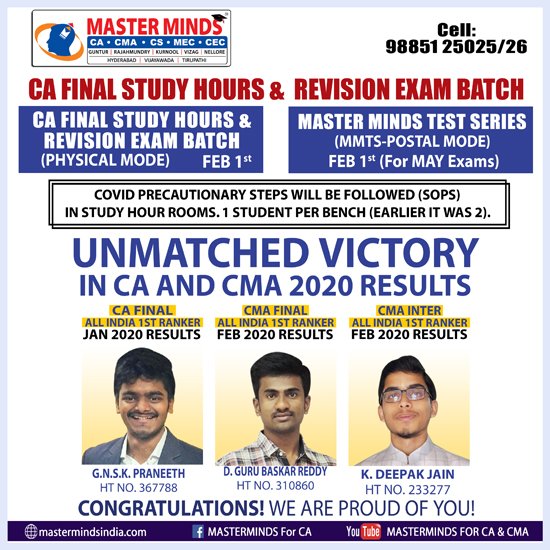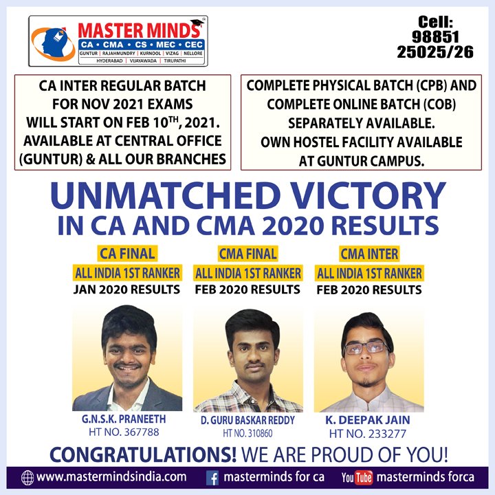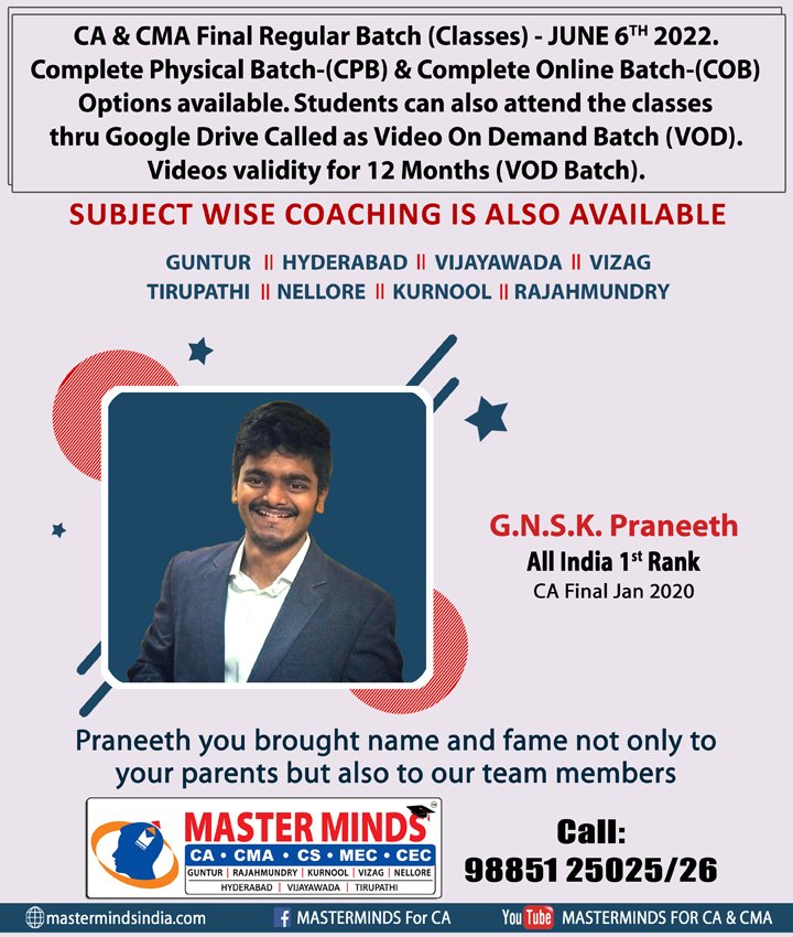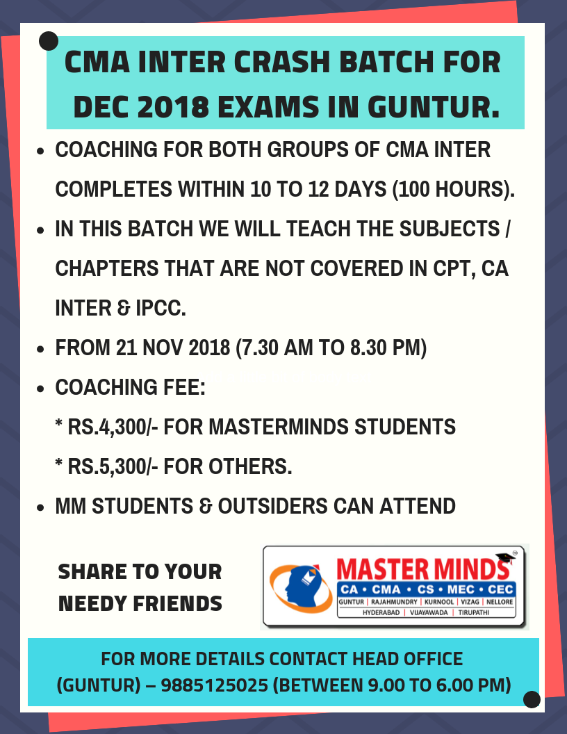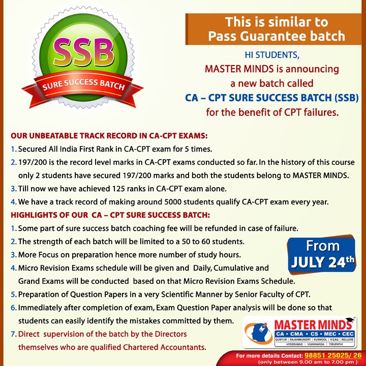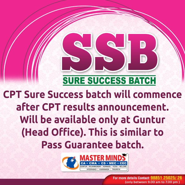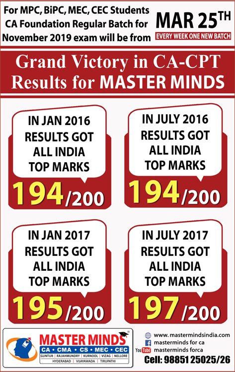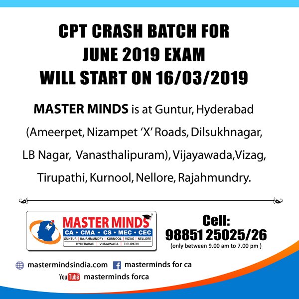 Next CA – CPT Crash / Short Term Batch will commence on Mar 24th (AT Guntur, Rajahmundry and Kurnool). For Details call to 9248733315. |