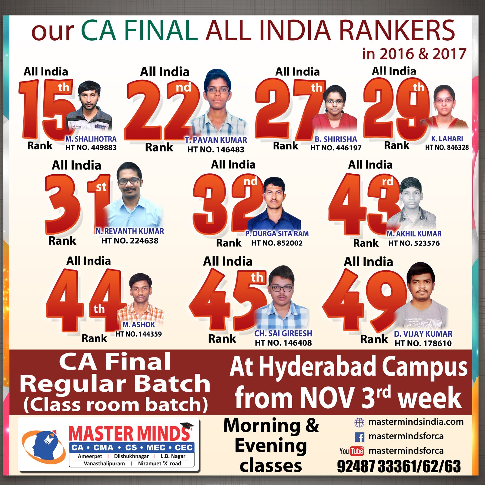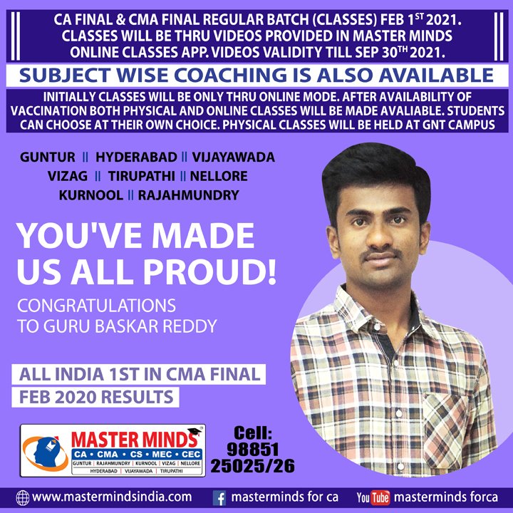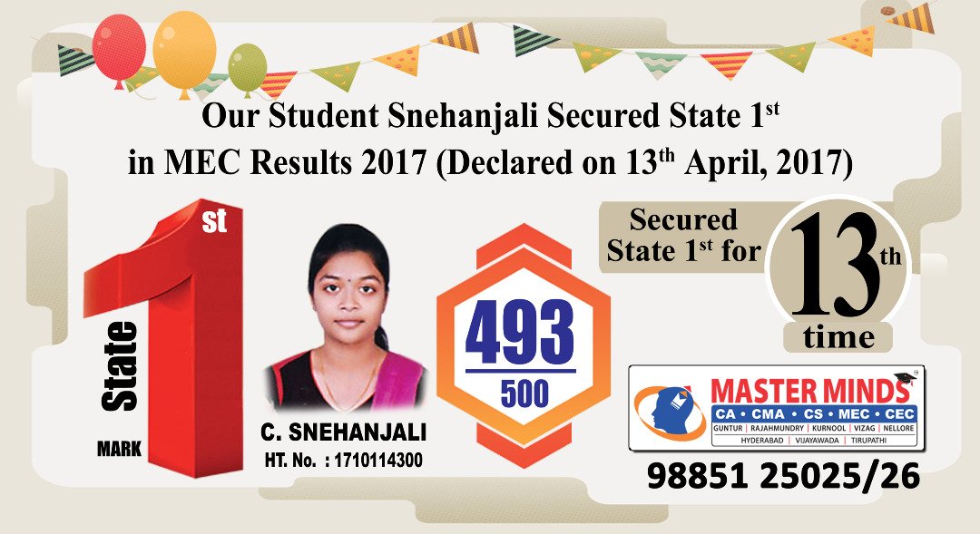 Master Minds congratulates Mr. Sai Srikanth and Hari Prasad, our students for bagging the All India 1st Rank in ICWA Exams. Click Here Visual |