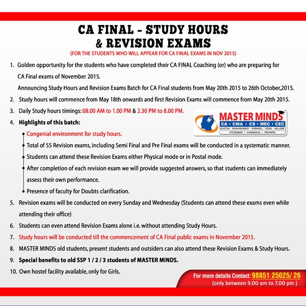 CA FINAL - STUDY HOURS & REVISION EXAMS - MAY 2015 |
