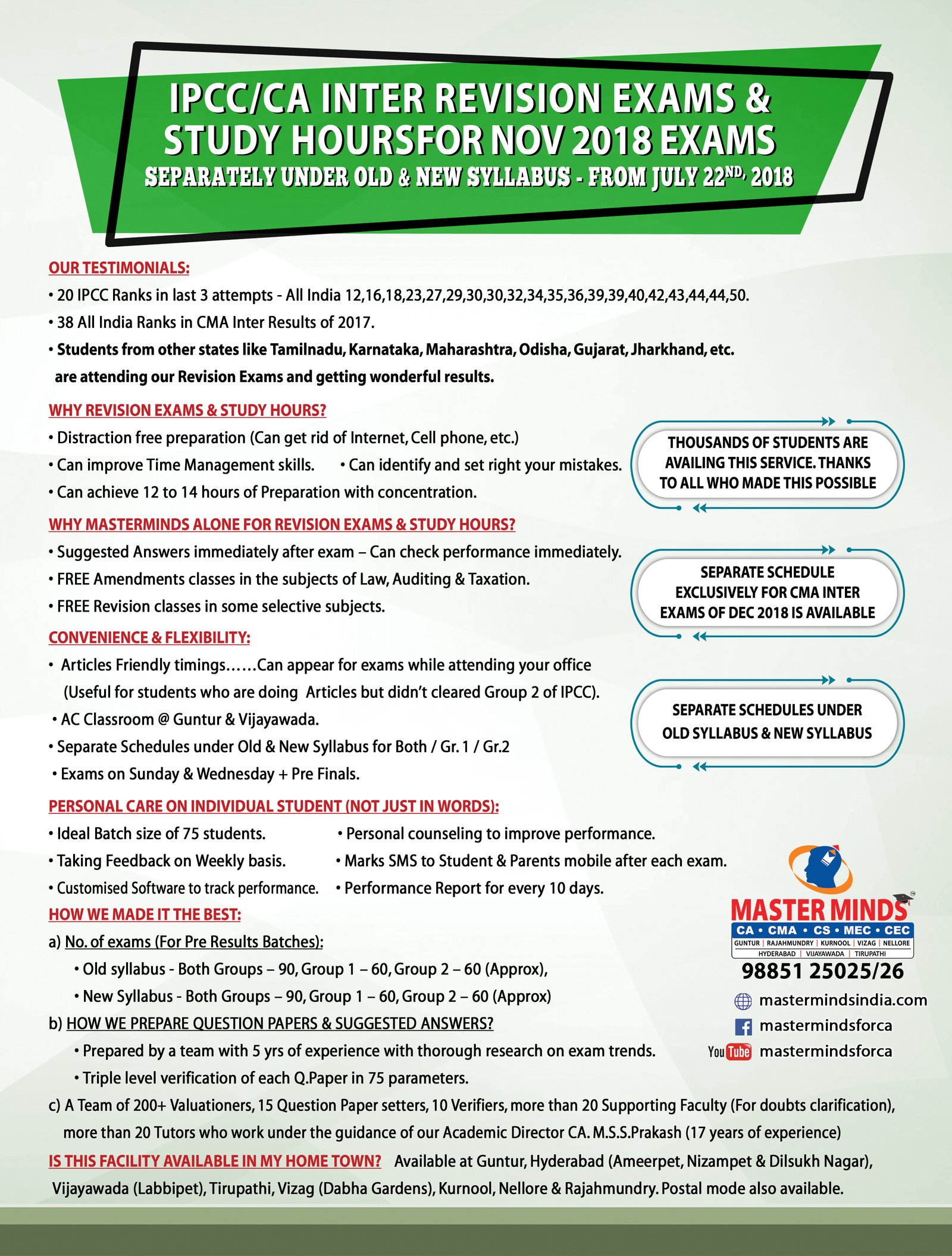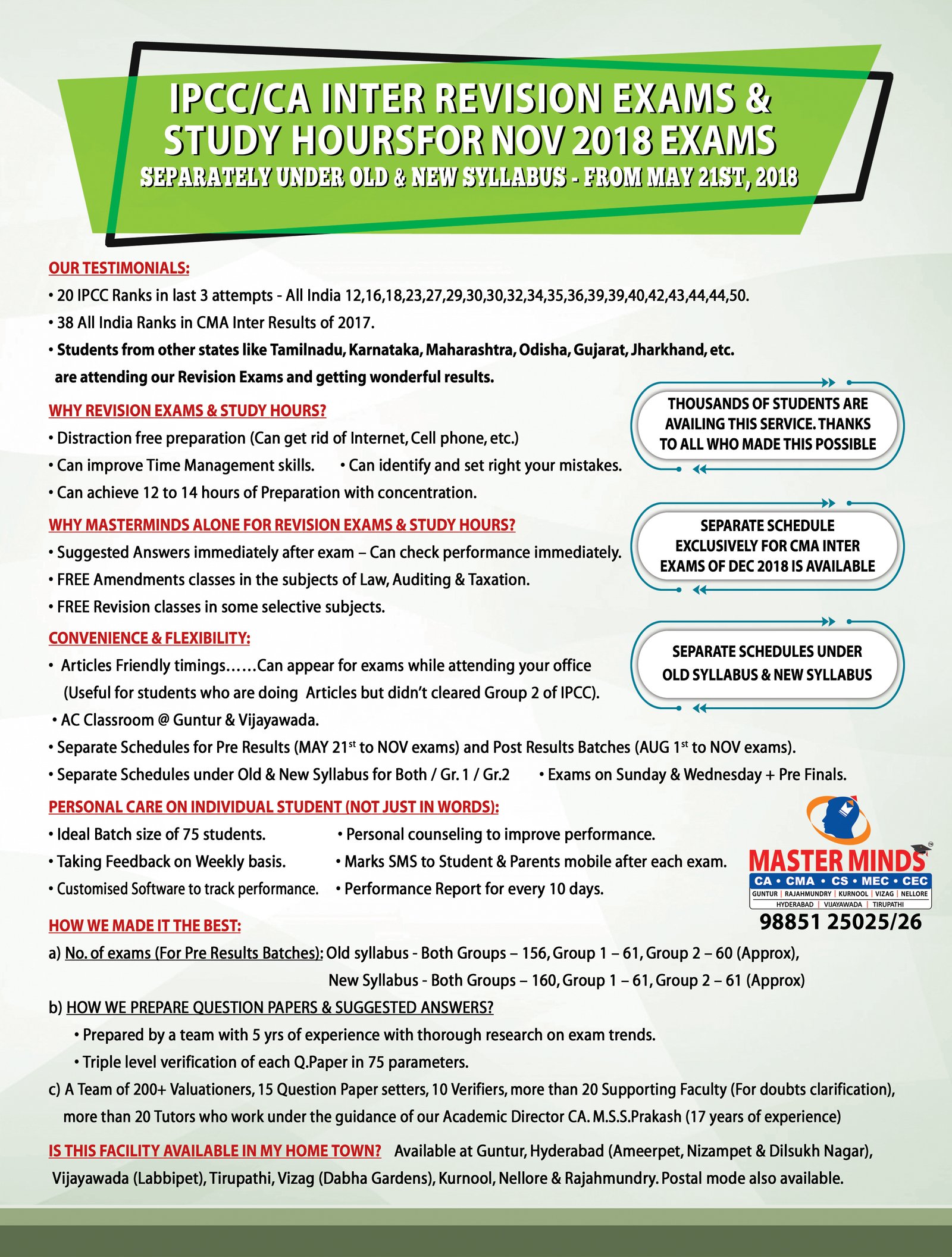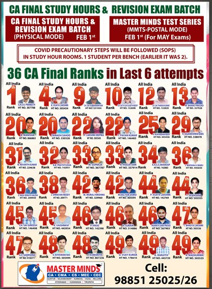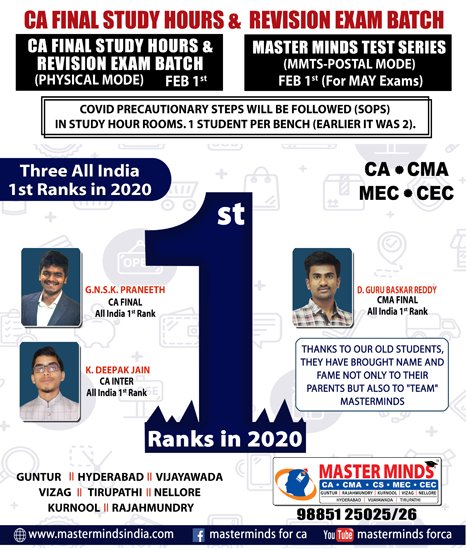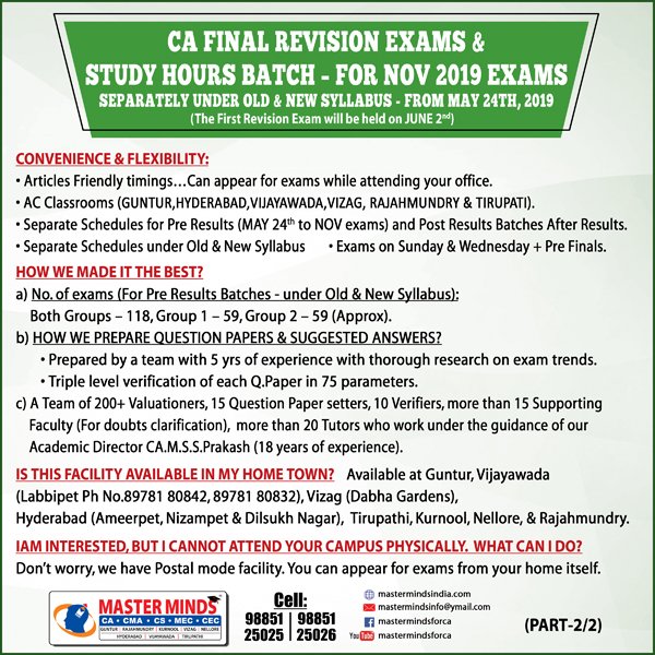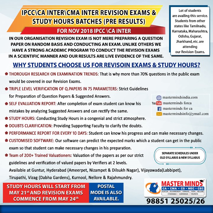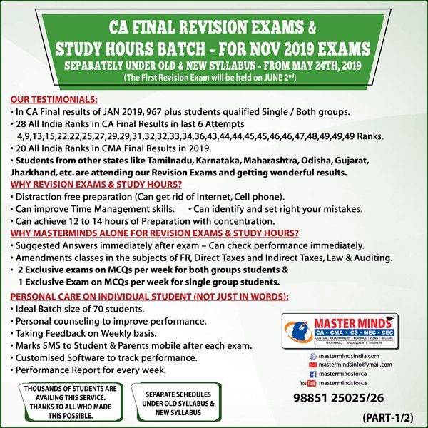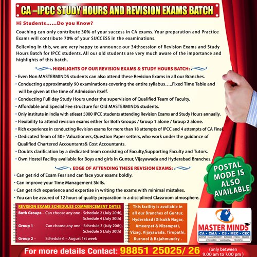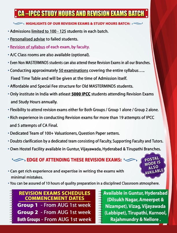 Free Revision classes for PCC/IPCC failed old Master Minds students. Details call Mr. Madhu 9248733313. |