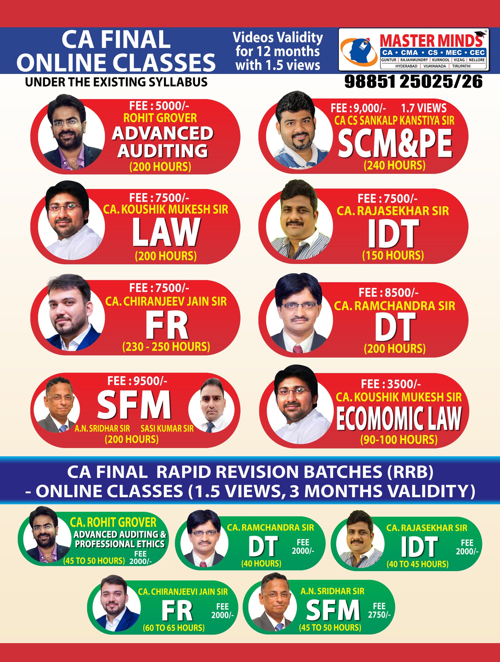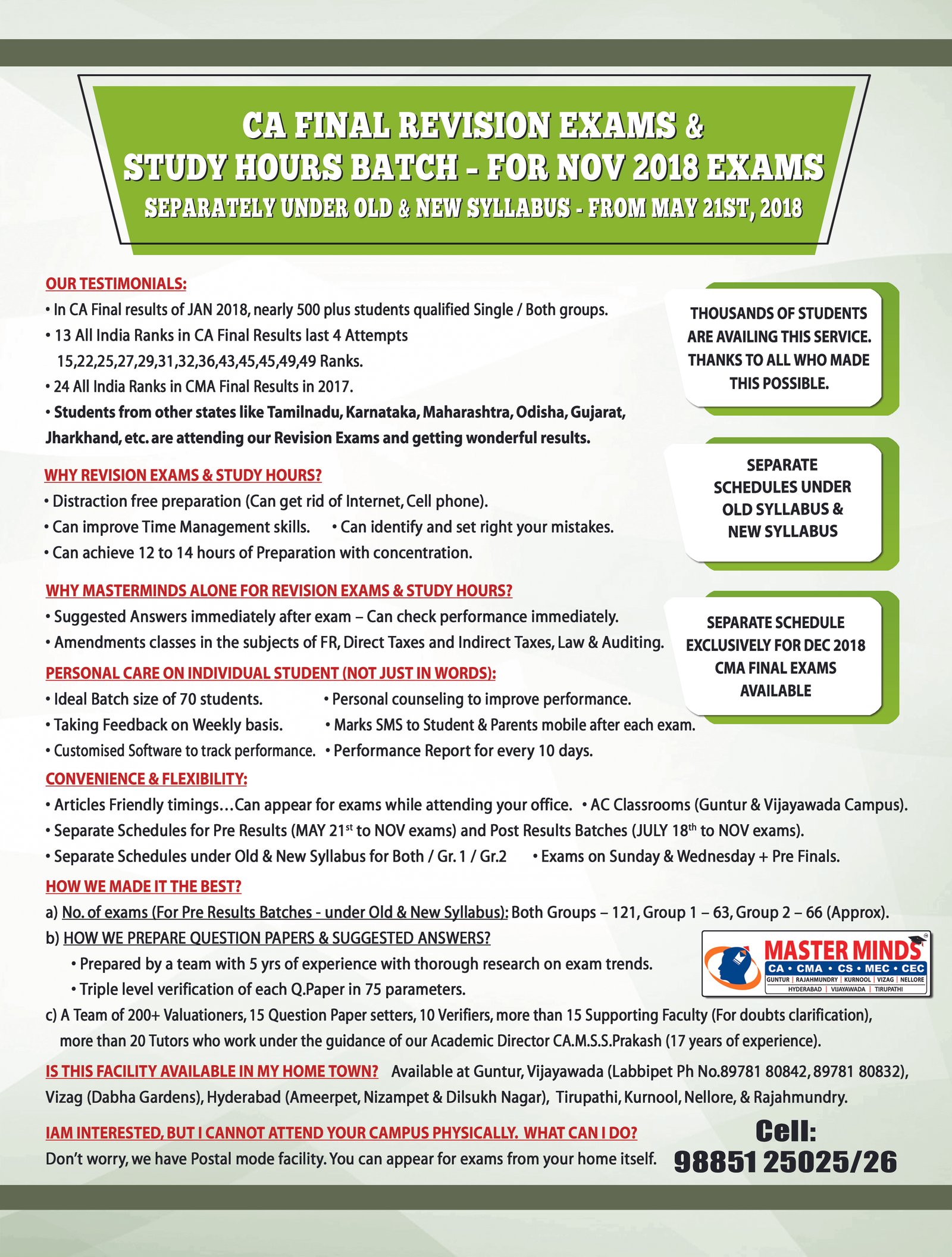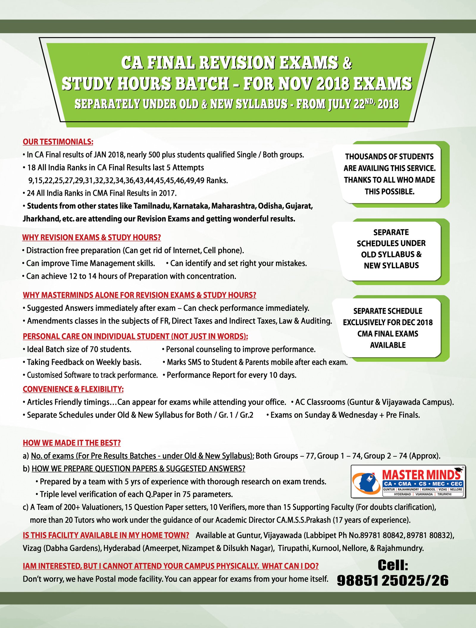 Free Revision classes for PCC/IPCC failed old Master Minds students. Details call Mr. Madhu 9248733313. |