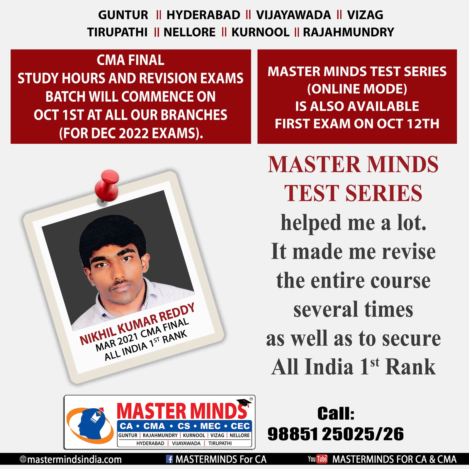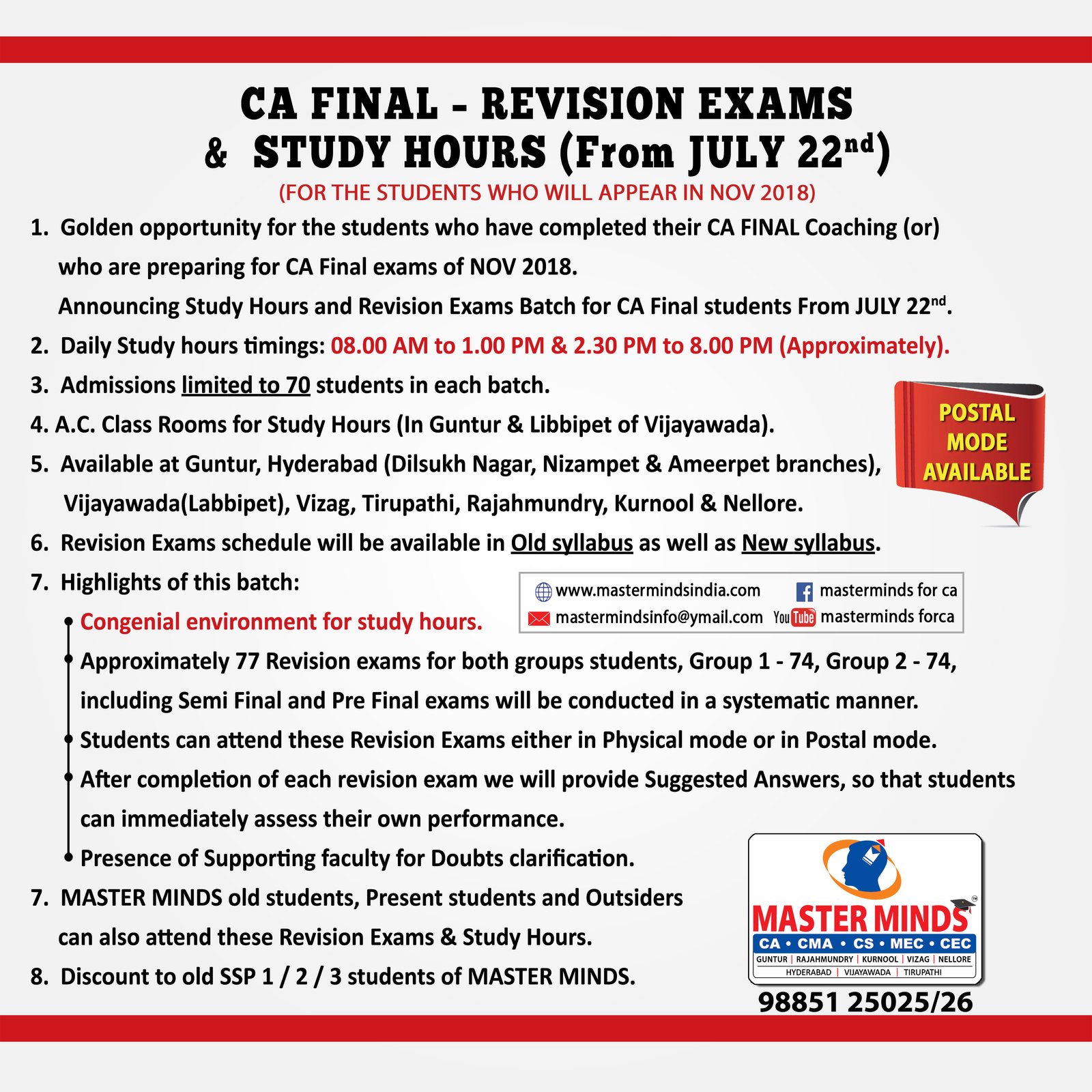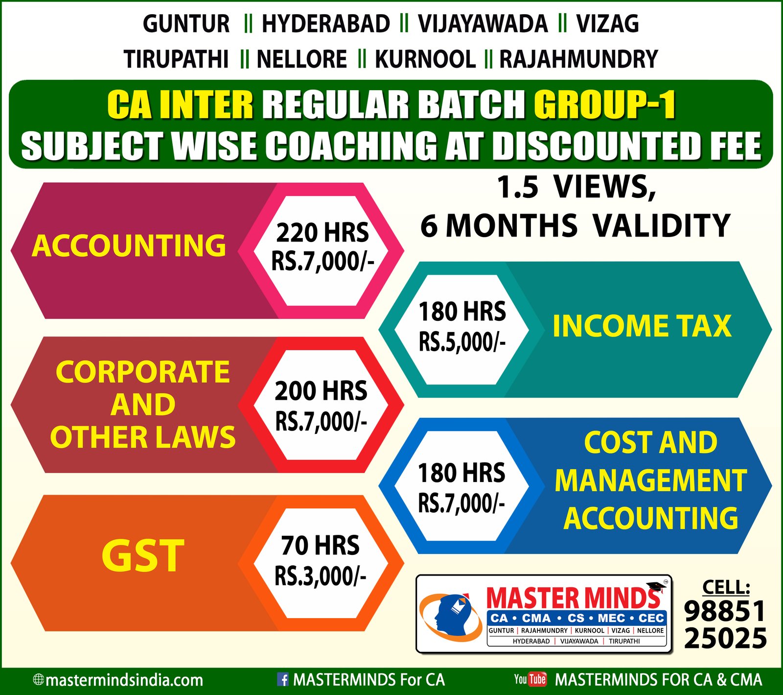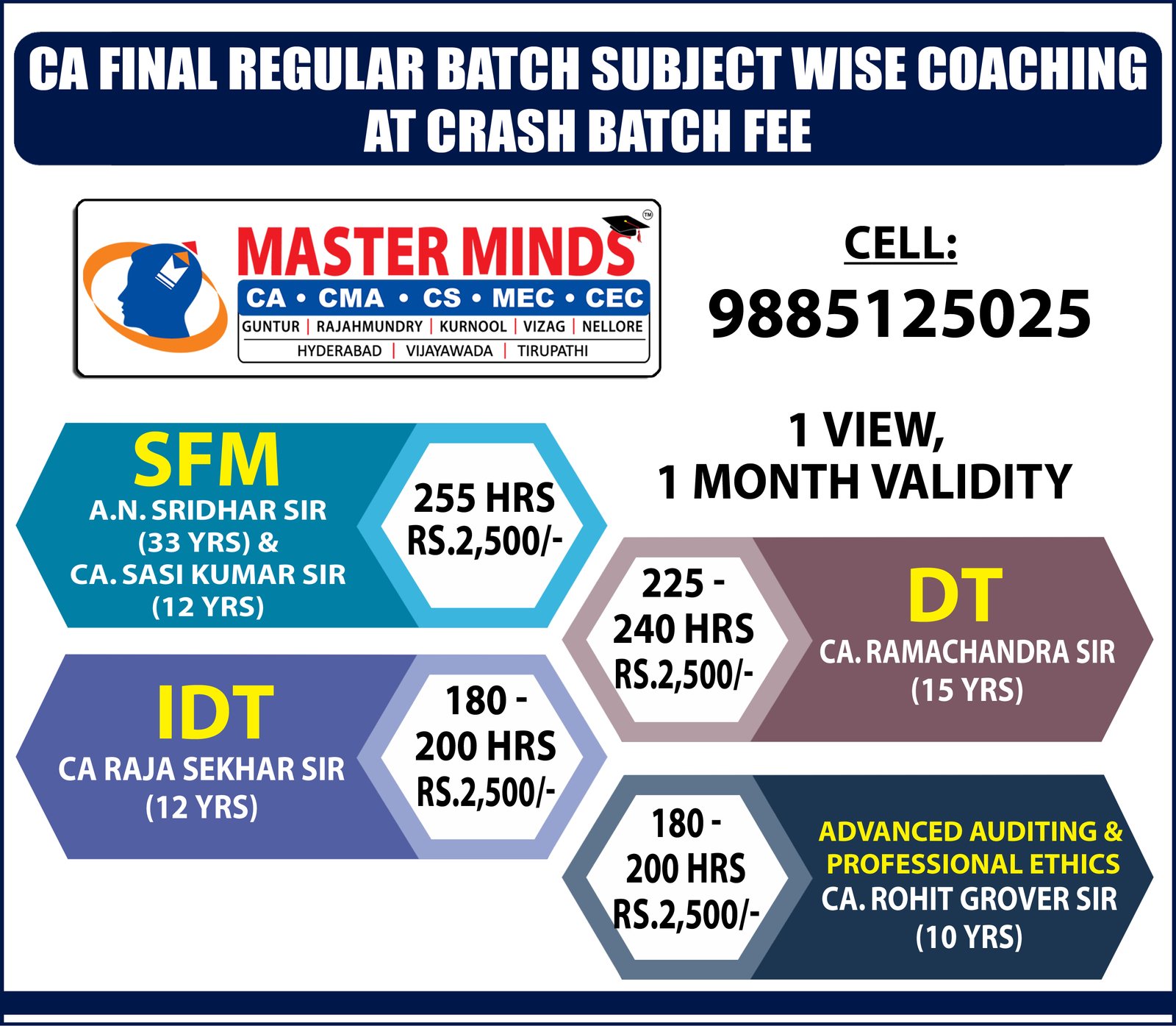 Free Revision classes for PCC/IPCC failed old Master Minds students. Details call Mr. Madhu 9248733313. |