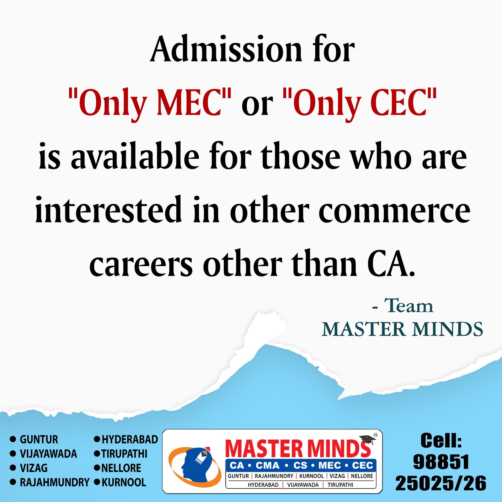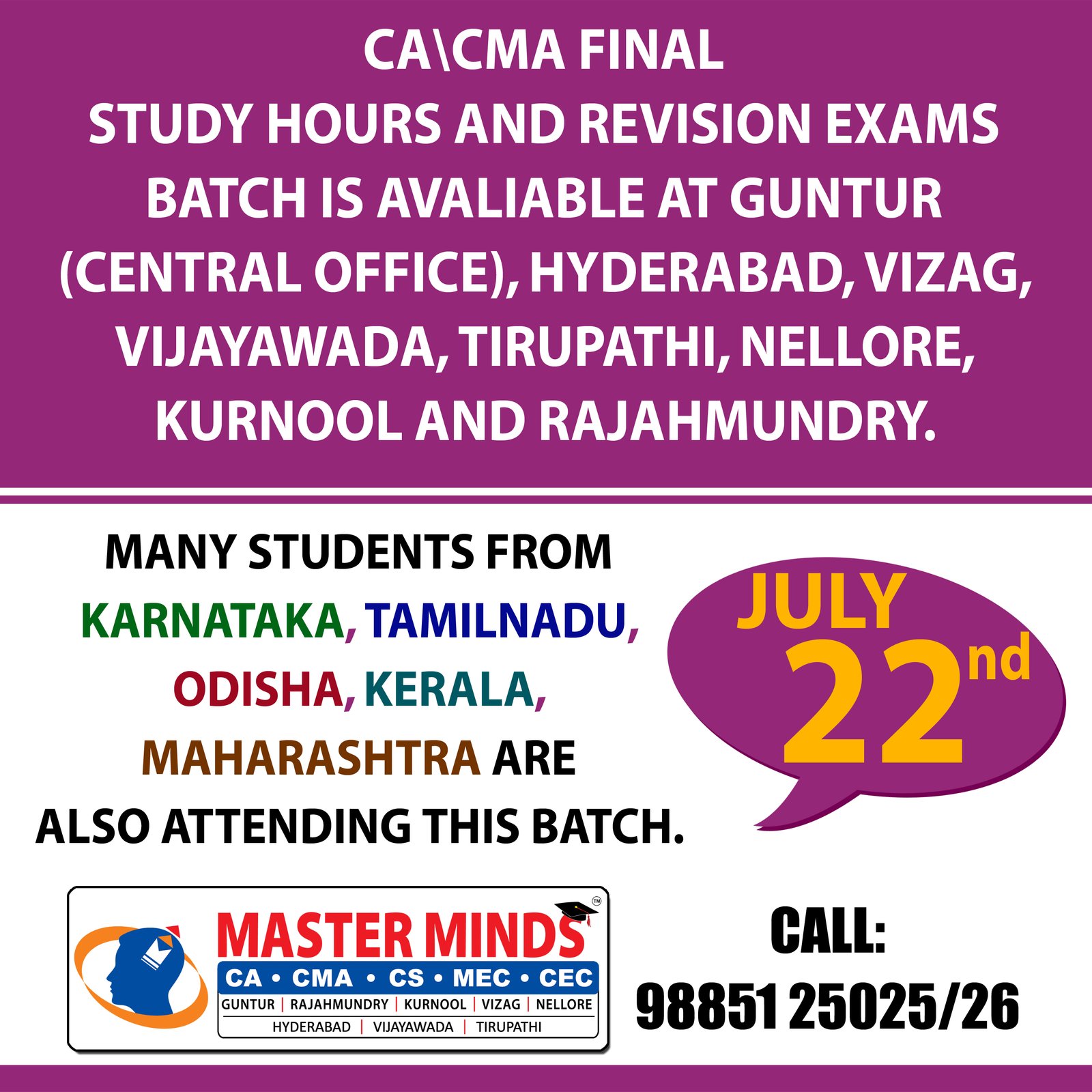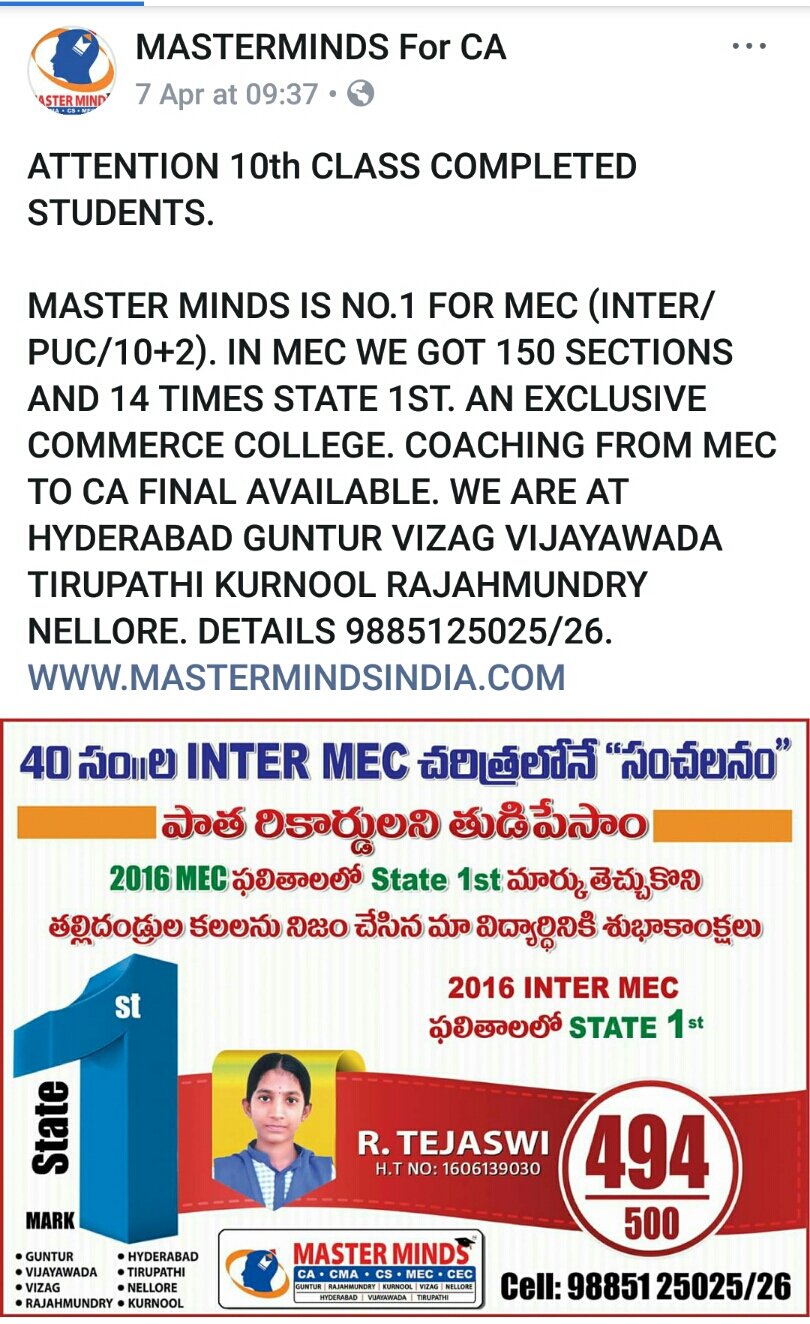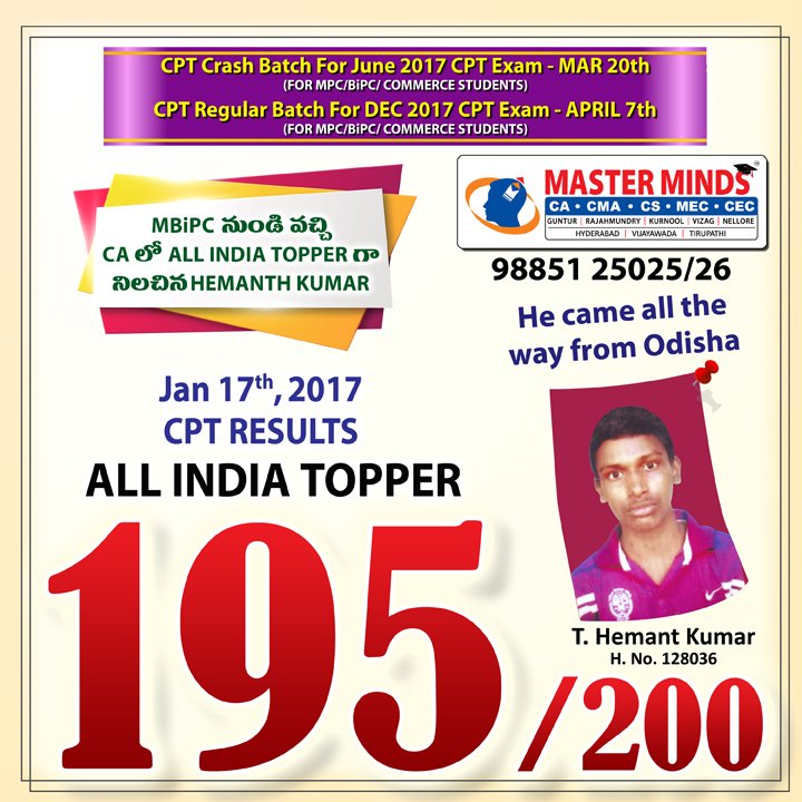 CA CPT ADMISSIONS ARE GOING ON. CROSSED 2000 ADMISSIONS. SPECIAL BATCH FOR MPC STUDENTS. MPC STUDENT GOT ALL INDIA 1ST. DETAILS CALL 9885125026. |
