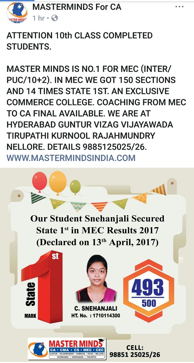 Masterminds 2009 MEC Completed 165 students got National Merit Scholarship of Rs.70,000/- (0ver 5 years a record in the history of Inermediate in Commerce). |