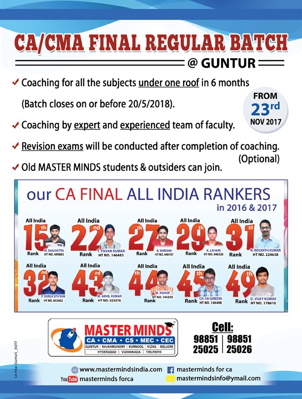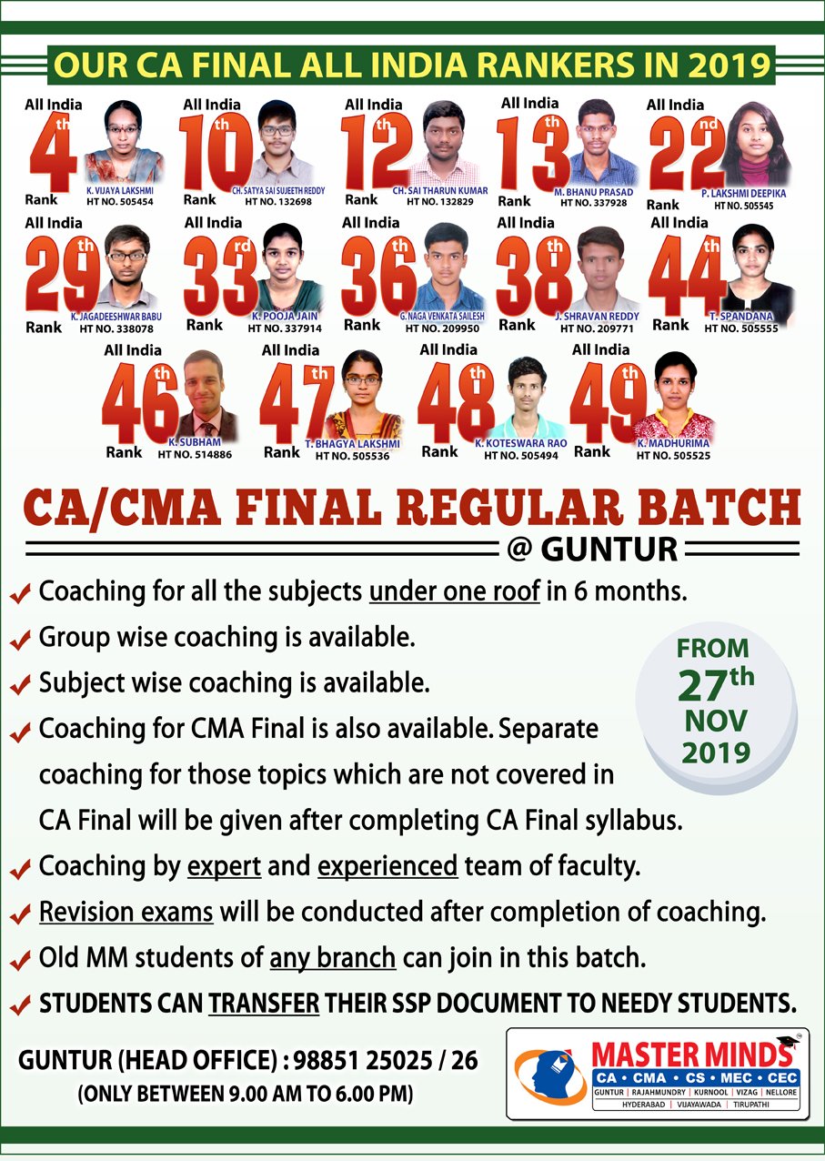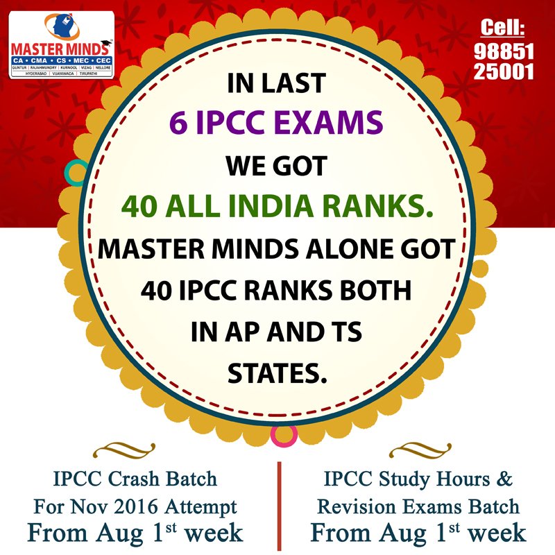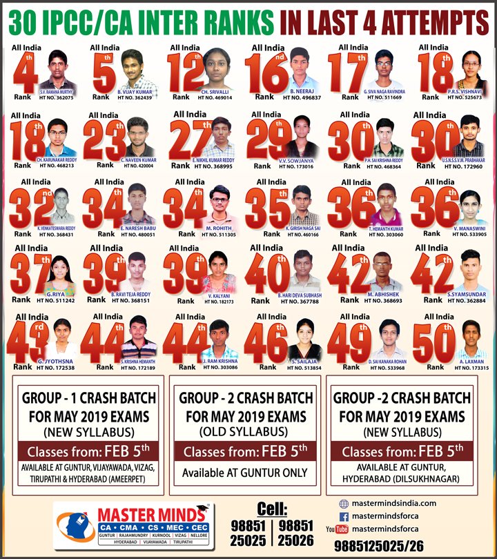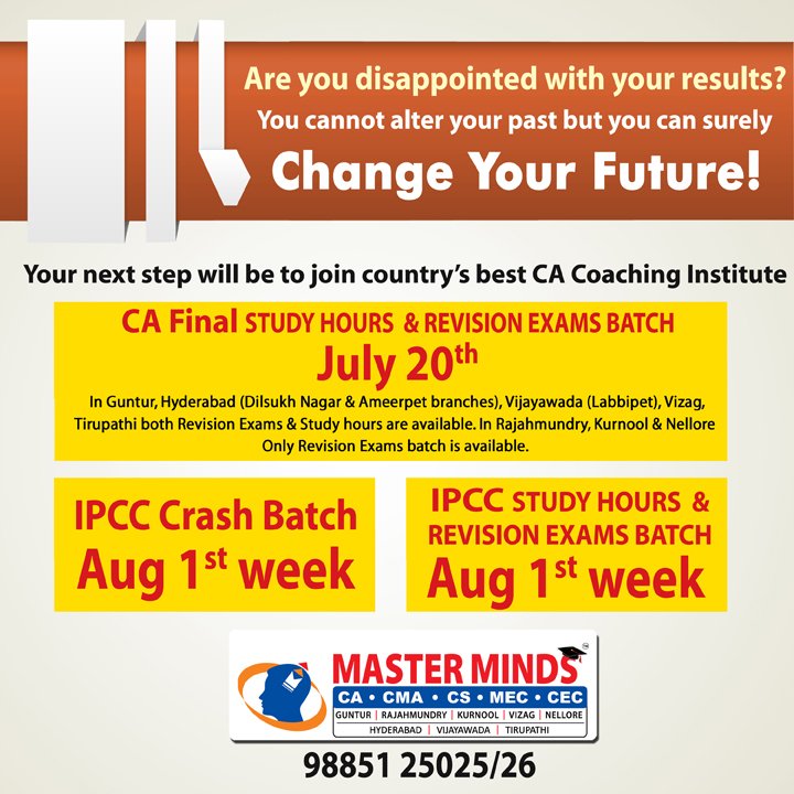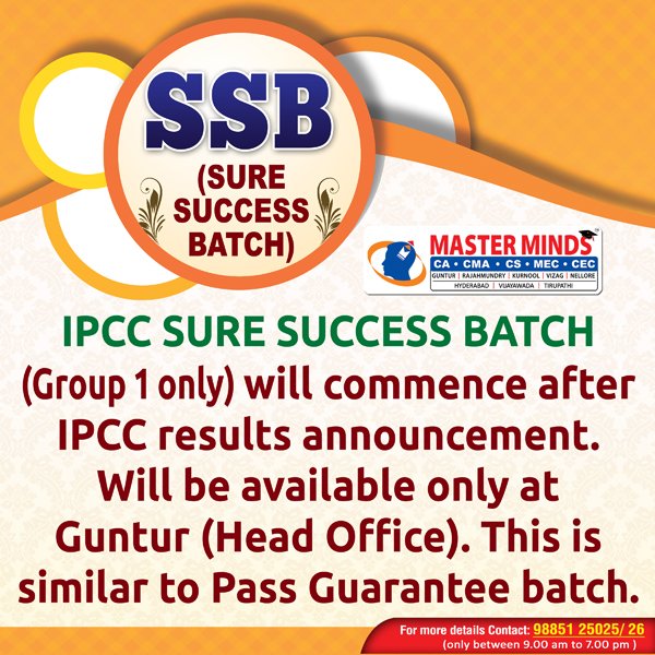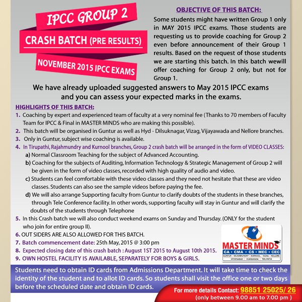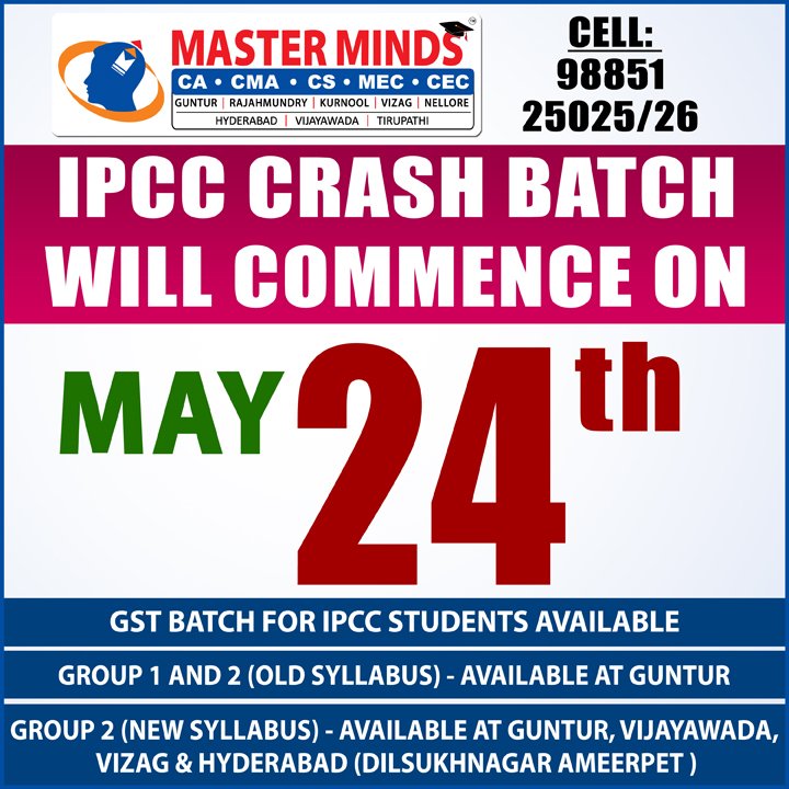 Next IPCC batch will commence from dec 27th at Guntur and from Jan 22nd at Kurnool. Details 92487 33315 / 13 |