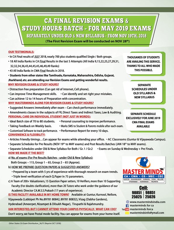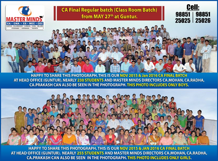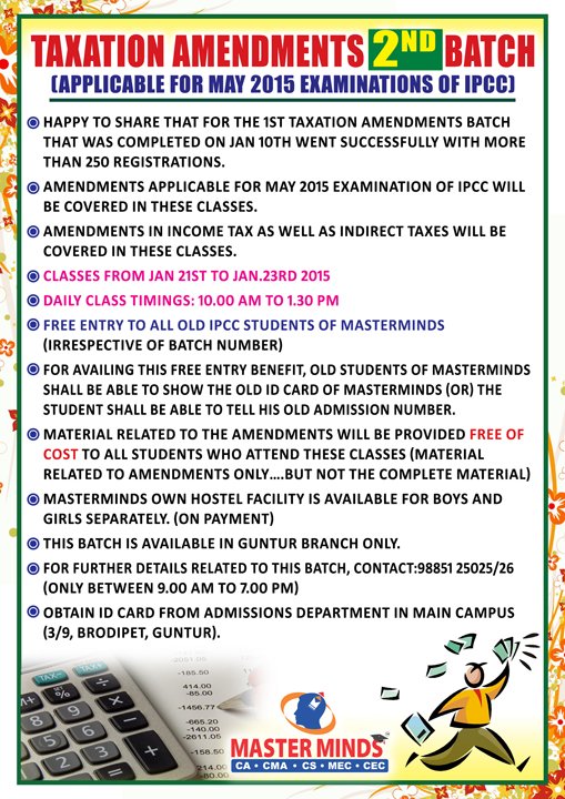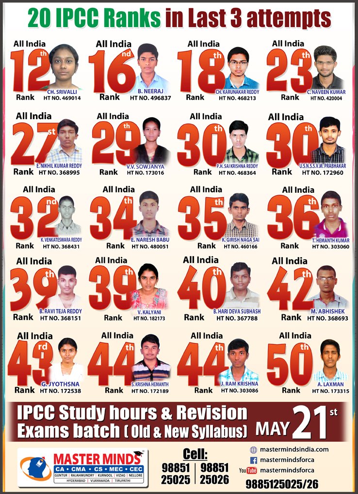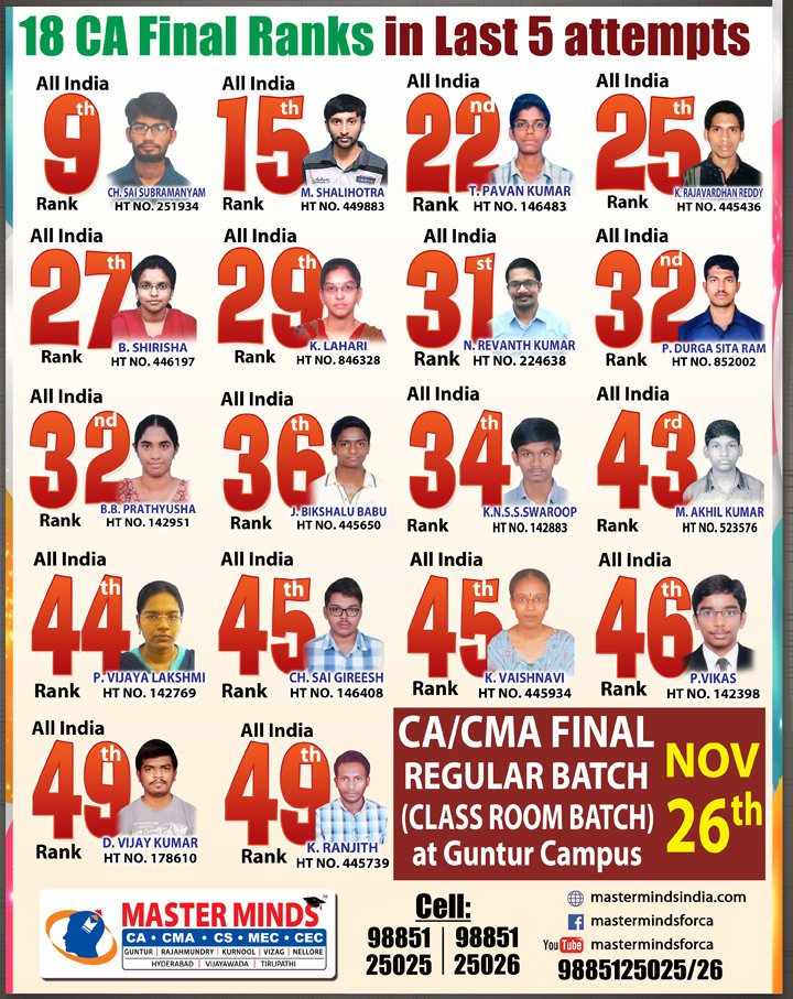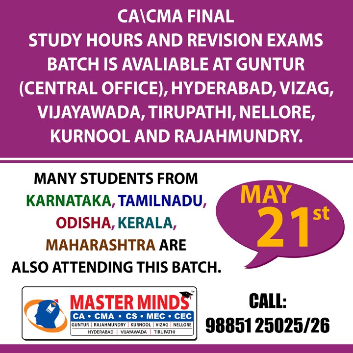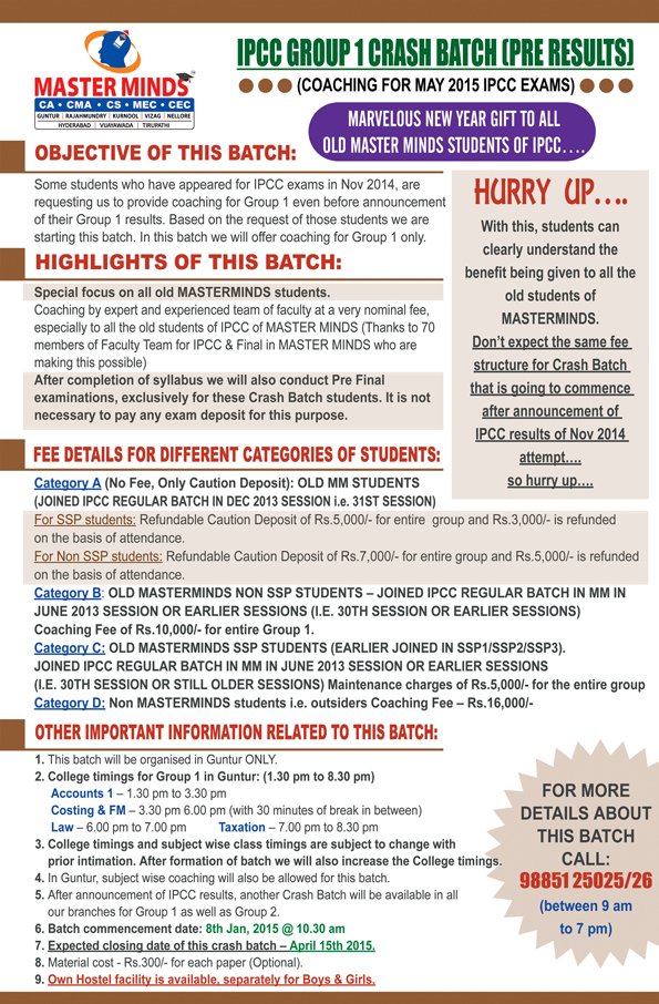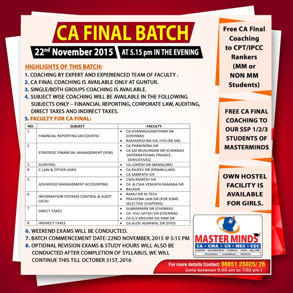 Next IPCC batch will commence from dec 27th at Guntur and from Jan 22nd at Kurnool. Details 92487 33315 / 13 |