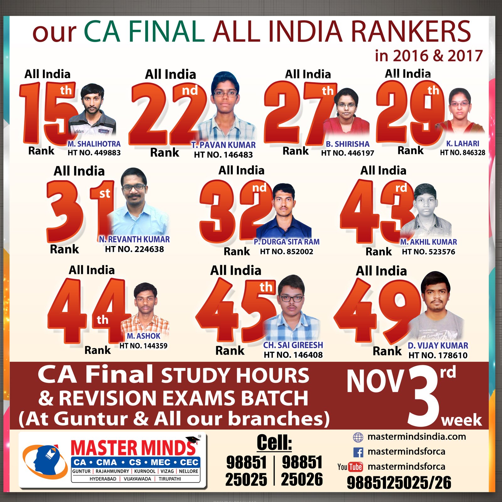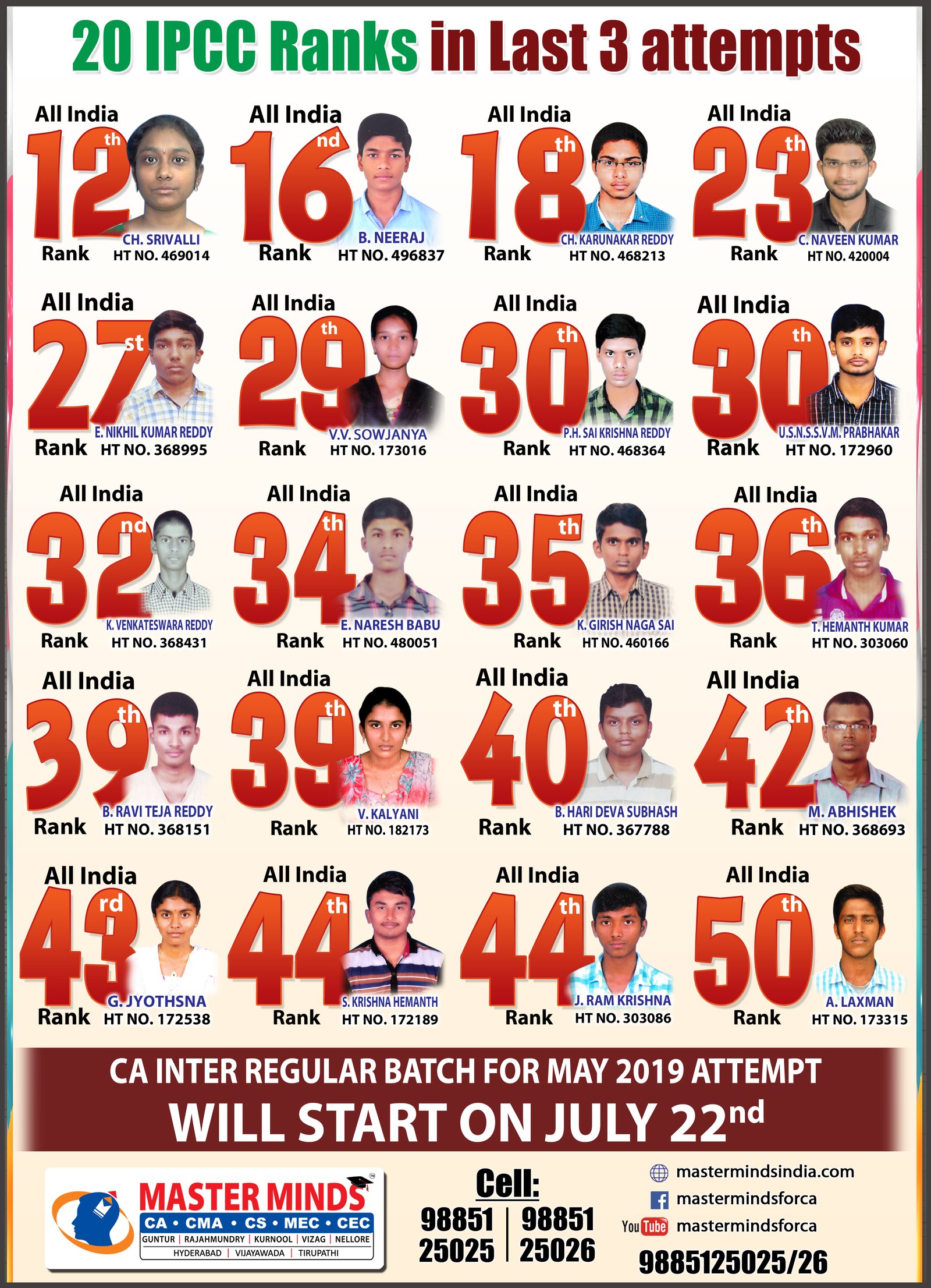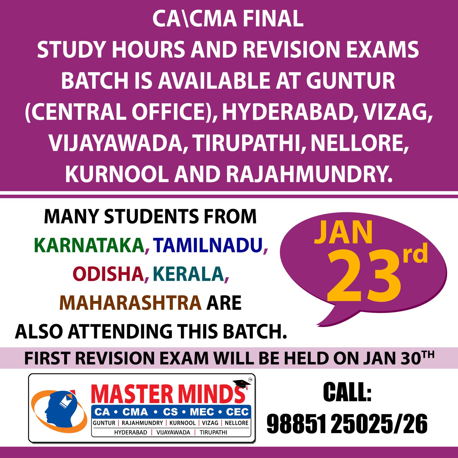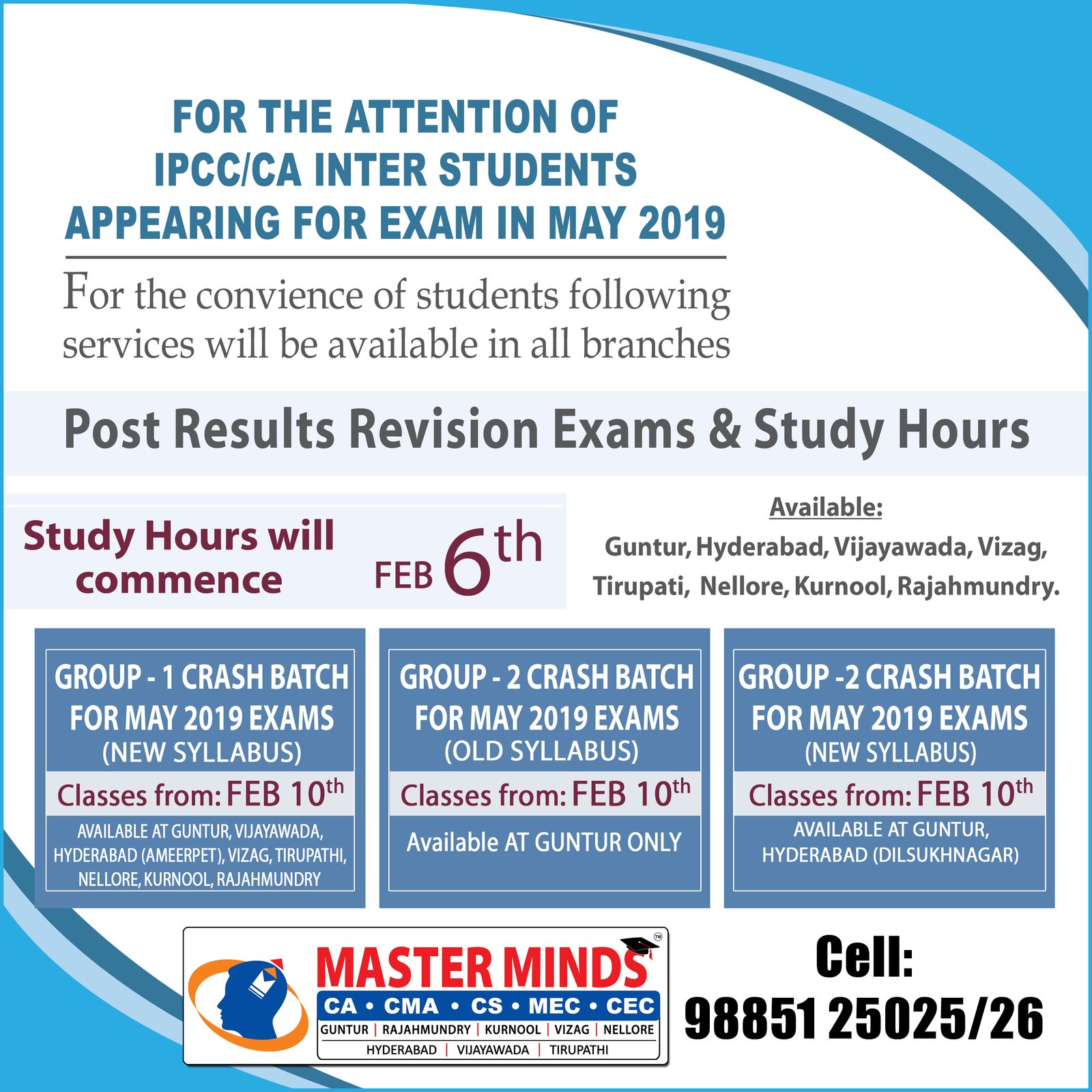 Next IPCC batch will commence from dec 27th at Guntur and from Jan 22nd at Kurnool. Details 92487 33315 / 13 |