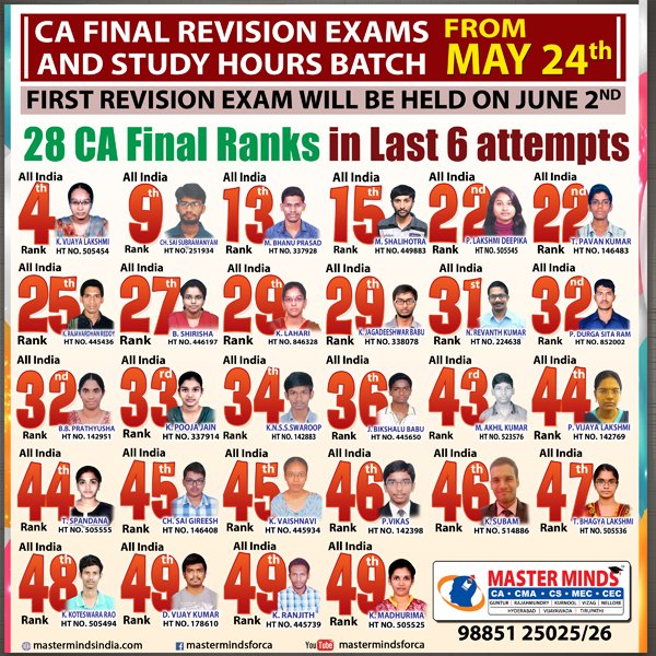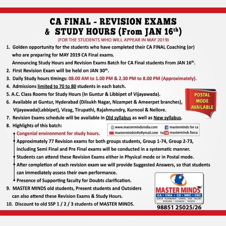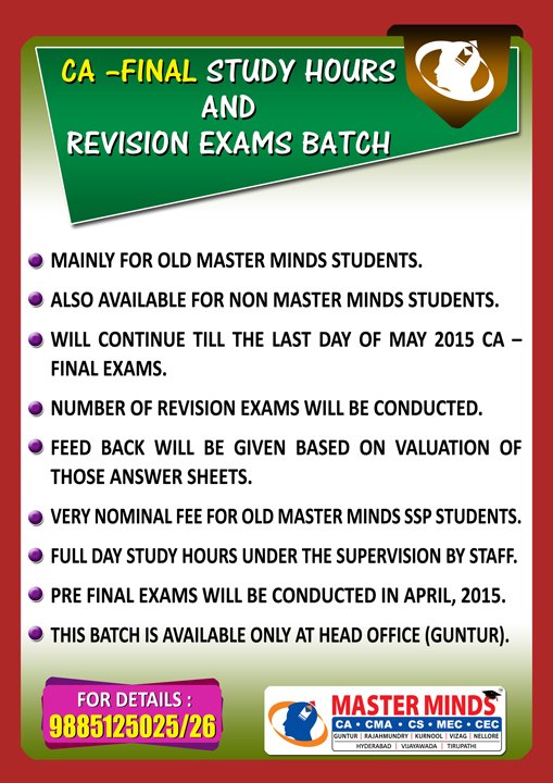 Free Revision classes for PCC/IPCC failed old Master Minds students. Details call Mr. Madhu 9248733313. |