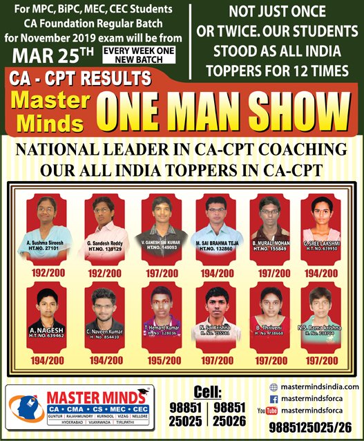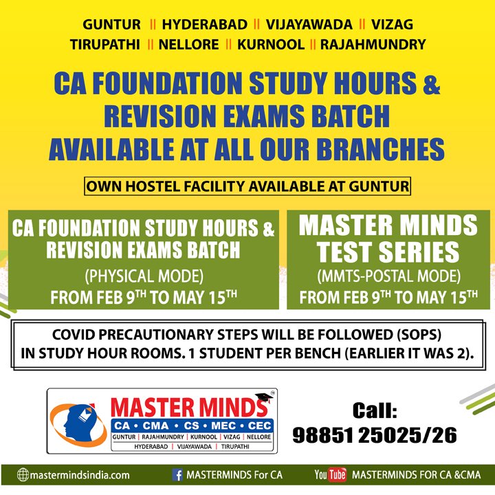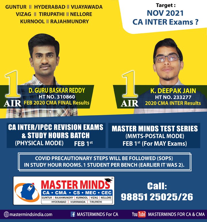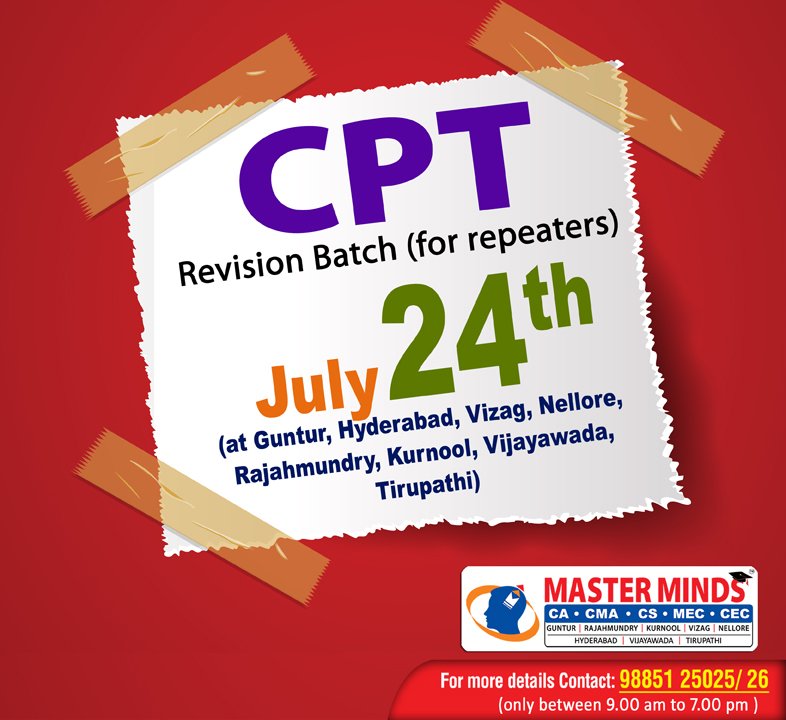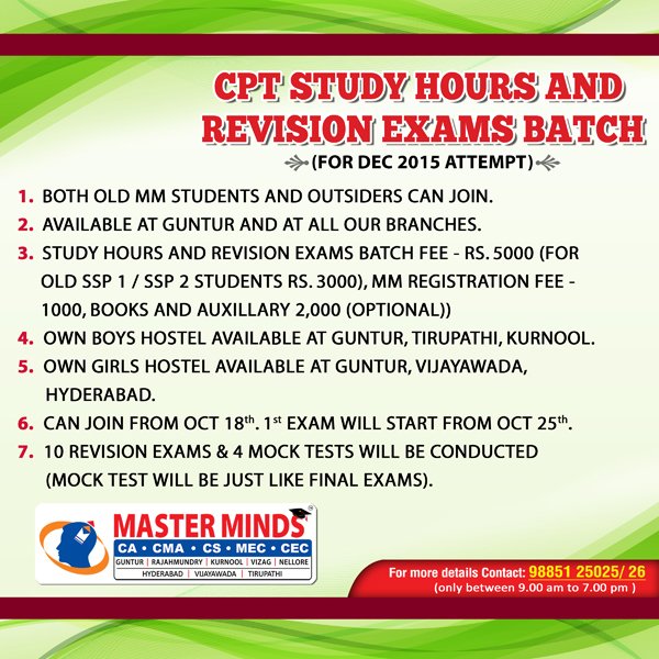 Next CA – CPT Crash / Short Term Batch will commence on Mar 24th (AT Guntur, Rajahmundry and Kurnool). For Details call to 9248733315. |