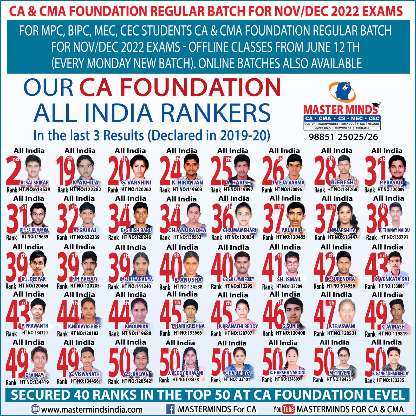 Master Minds congratulates Mr. Sai Srikanth and Hari Prasad, our students for bagging the All India 1st Rank in ICWA Exams. Click Here Visual |