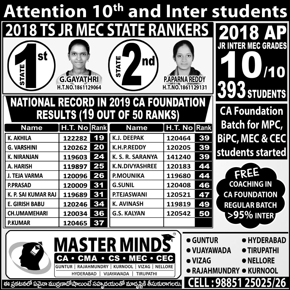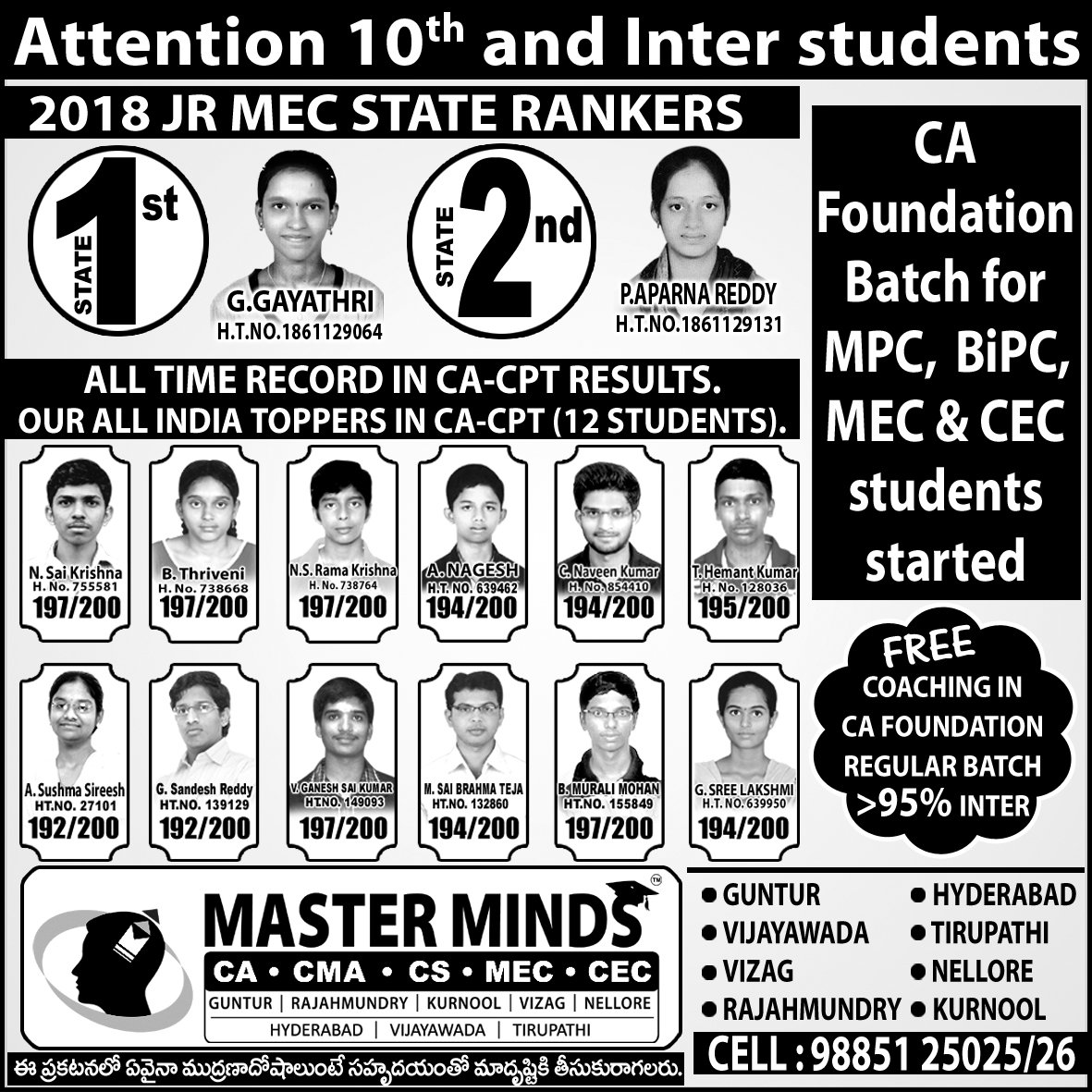 CA CPT ADMISSIONS ARE GOING ON. CROSSED 2000 ADMISSIONS. SPECIAL BATCH FOR MPC STUDENTS. MPC STUDENT GOT ALL INDIA 1ST. DETAILS CALL 9885125026. |